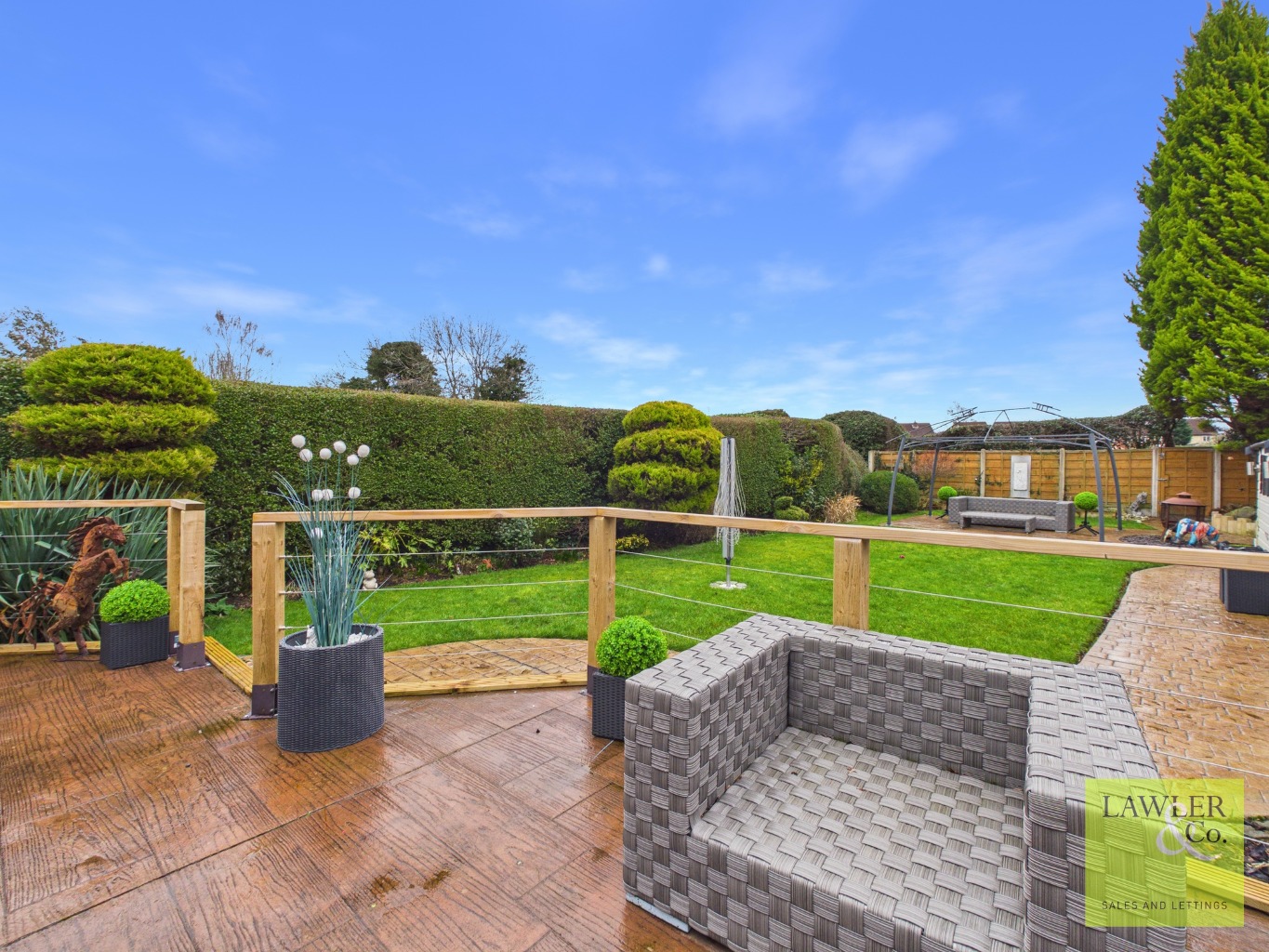 Externally, the front of the property boasts a spacious driveway providing ample parking for multiple vehicles, bordered by mature hedging. To the rear, accessed via a side gate, is a generous garden featuring a raised decking area ideal for seating and entertaining. Steps lead down to a mainly lawned garden with a pathway extending to the bottom, where a rear gate opens directly onto the fields beyond — perfect for children to play while remaining close to home.