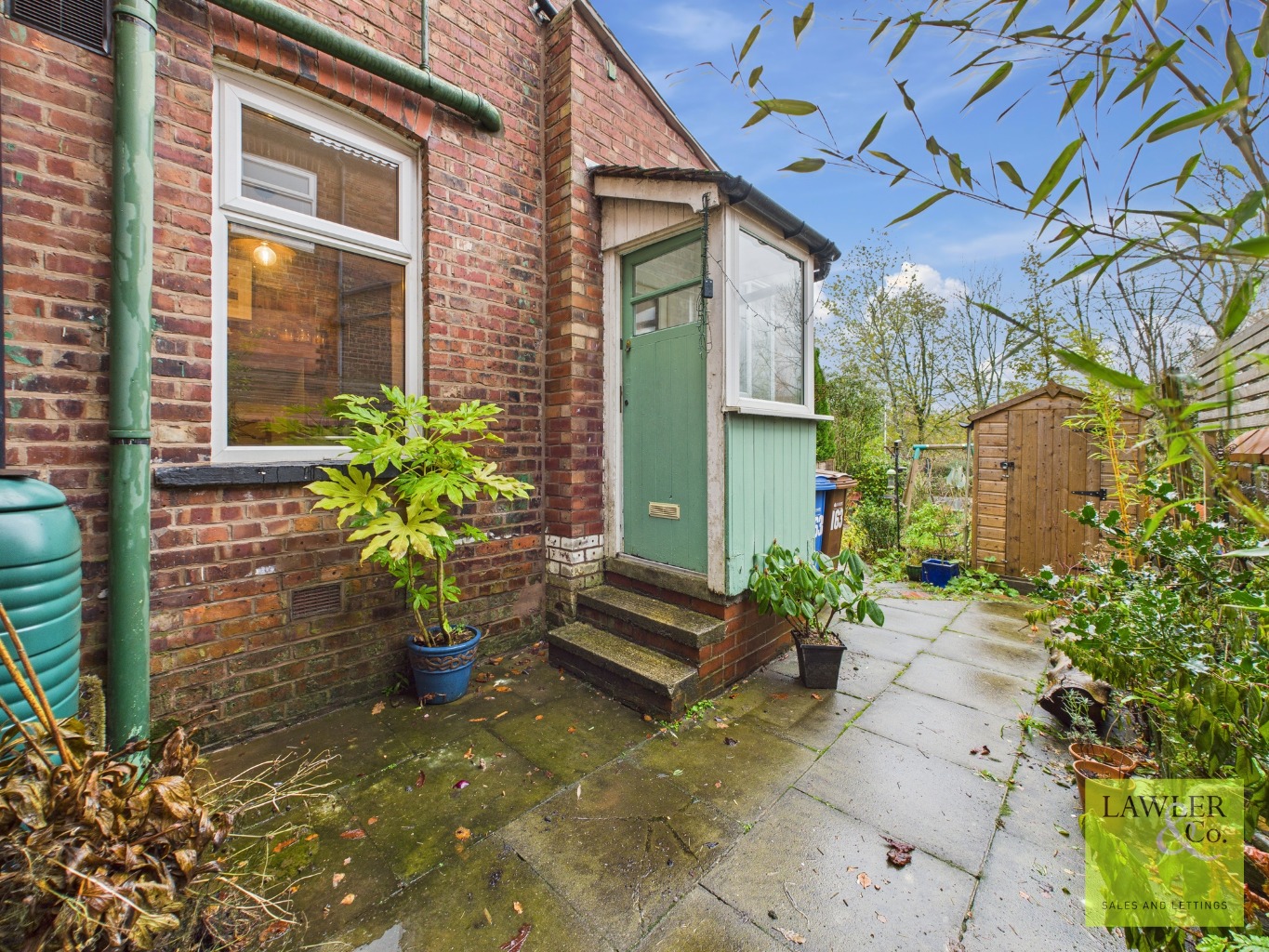 To the rear, a sizeable garden awaits, predominantly laid to lawn and complemented by a generous patio area—perfect for hosting and socialising. The garden is enriched with an array of mature trees, shrubs and bushes, including apple, cherry and magnolia trees as well as gooseberries, blackcurrants, strawberries, roses, and rhododendrons. Additional features include a greenhouse and a useful garden shed and views over to Mellor hills. To the front of the property you will find a private paved yard with a metal gate, EV charger, on street parking as well as a shared driveway with the neighbour.