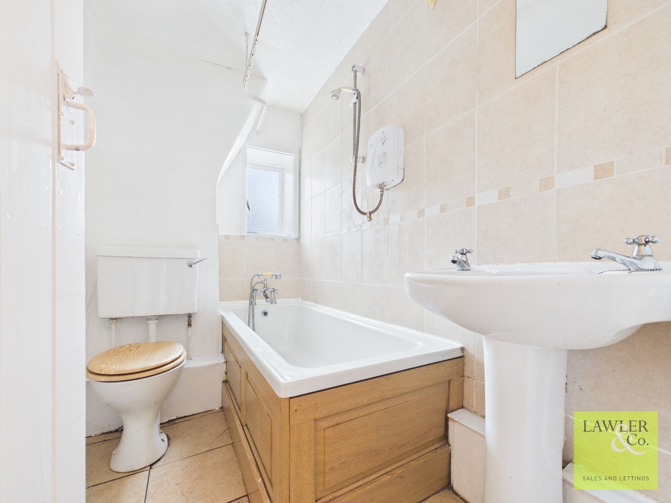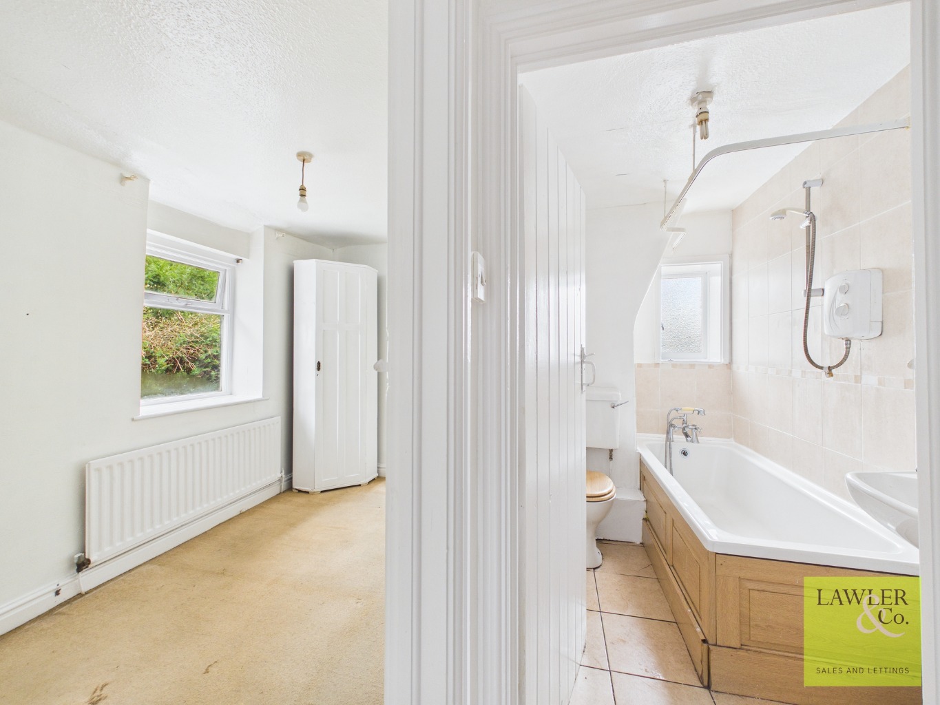 To the first floor, the property offers a generous double bedroom with views to a lovely neighbouring garden and a well-proportioned single bedroom with built-in storage. A family bathroom with shower over bath completes the accommodation. Throughout, the home boasts charming character features including stone accents, original beams and traditional cottage-style wooden doors and windows.