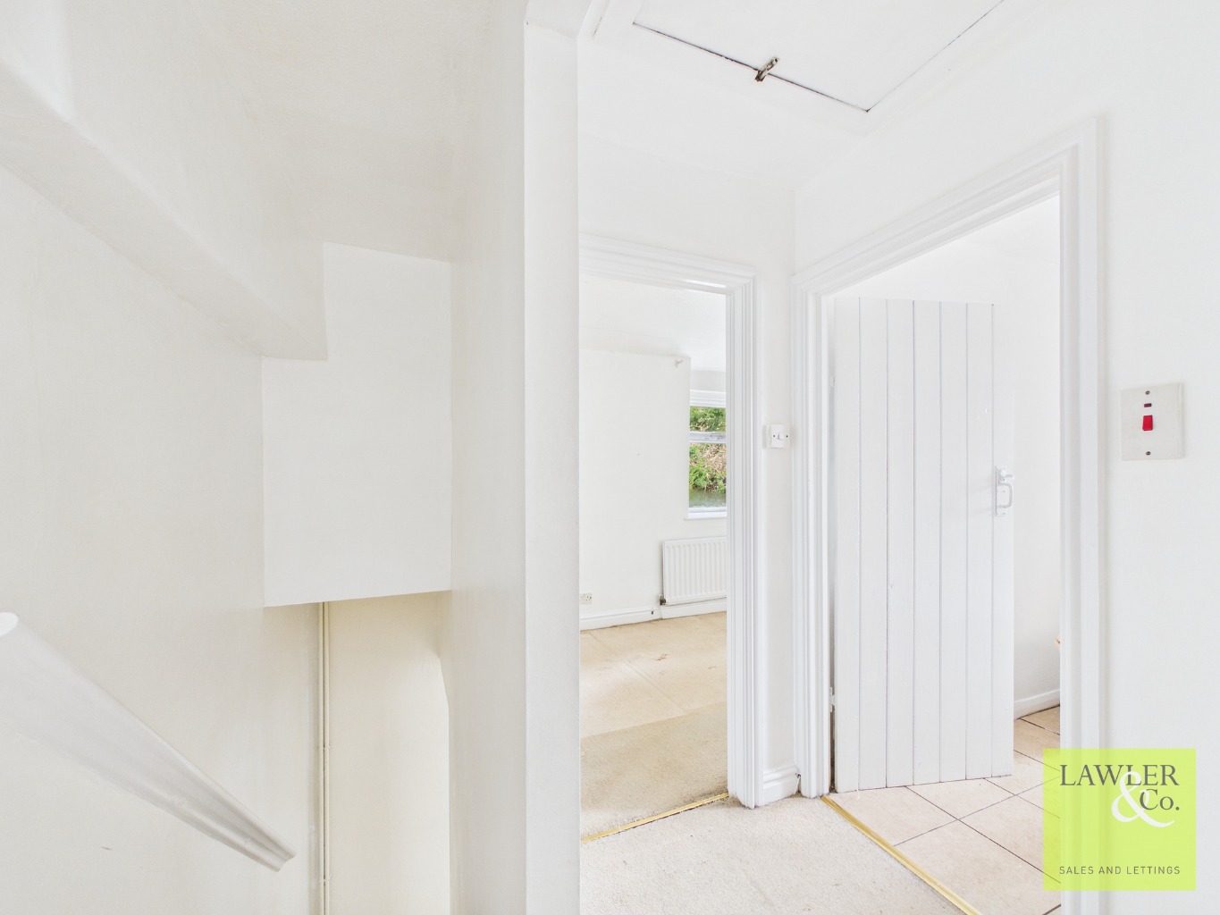 A couple of steps lead up to the kitchen, thoughtfully arranged with a range of wall and base units, built-in hob and oven, sink and space for a small fridge and washer/dryer. From here, a door opens onto the rear courtyard, which provides shared access to a secluded garden area and an outside brick shed — ideal for additional storage.