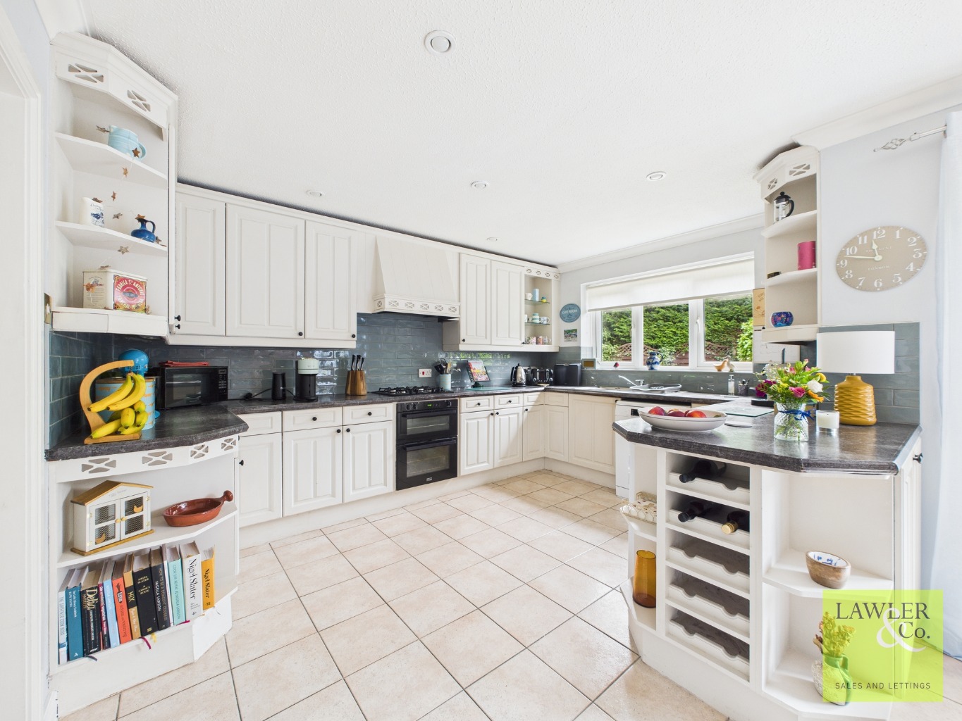 To the rear, a fantastic open-plan kitchen and dining area boasts plenty of cupboard space with both eye- and base-level units, a stylish tiled splashback, integrated oven and hob, and space for additional appliances. Patio doors open directly onto the private rear garden, creating a seamless indoor-outdoor living experience. Just off the kitchen, a practical utility room adds further convenience.
