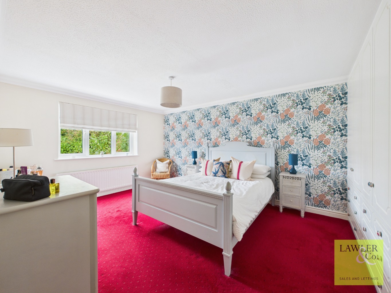 Upstairs, the home offers four generously sized double bedrooms. The main bedroom benefits from fitted wardrobes and a private en-suite shower room, while two further bedrooms also include fitted storage. The landing houses another spacious storage cupboard and leads to the well-appointed four-piece family bathroom, complete with bath, shower cubicle, WC, and hand wash basin.