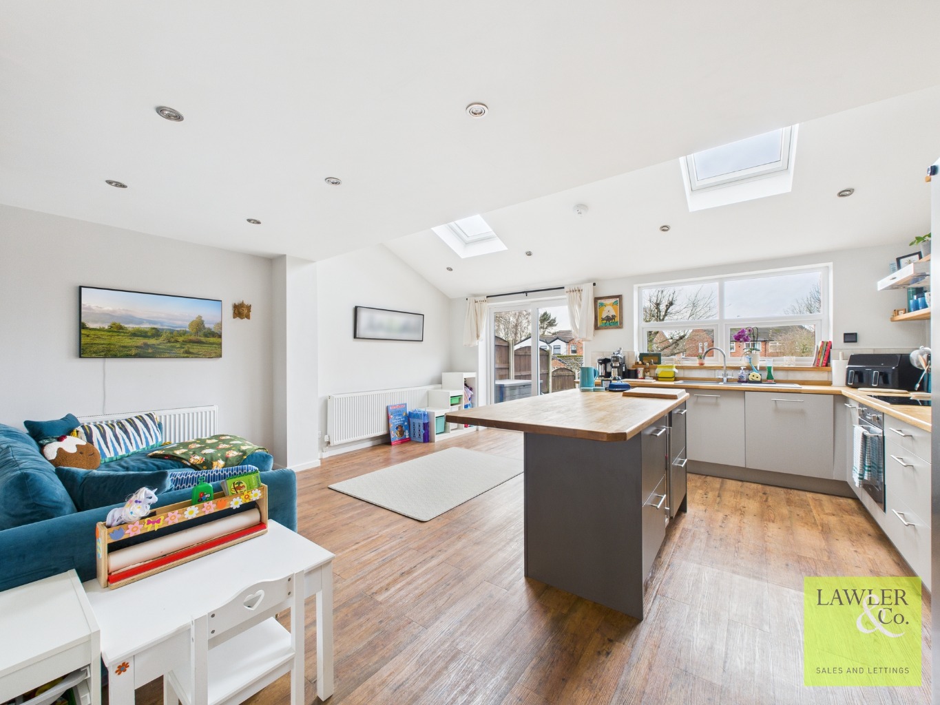 Ideally positioned within a quiet and highly desirable cul-de-sac, this beautifully presented and extended four-bedroom semi-detached family home offers spacious, well-balanced accommodation throughout. Conveniently located close to Poynton centre, excellent local schools, countryside walks and superb transport links, the property is perfectly suited to modern family living. The welcoming entrance hallway sets the tone for the home, leading through to a cosy front lounge featuring a charming bay window and log burner. Double doors open seamlessly into the stunning open-plan kitchen and dining area, which truly forms the heart of the home. Designed with both style and functionality in mind, the kitchen boasts a central island with induction hob and integrated extractor, wine fridge, integrated oven, microwave and dishwasher, along with ample space for an American-style fridge freezer. A comprehensive range of eye and base-level units is complemented by useful under-stairs storage. Two Velux skylights flood the space with natural light, while a sliding double door door leads directly out to the rear garden. Off the kitchen is a convenient downstairs WC with wash basin, along with internal access to the integral garage, which offers potential for conversion subject to the necessary consents.