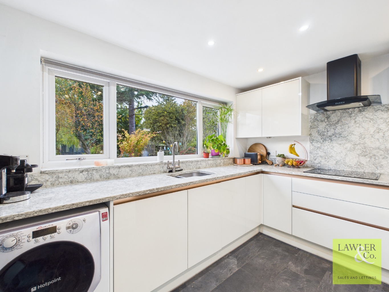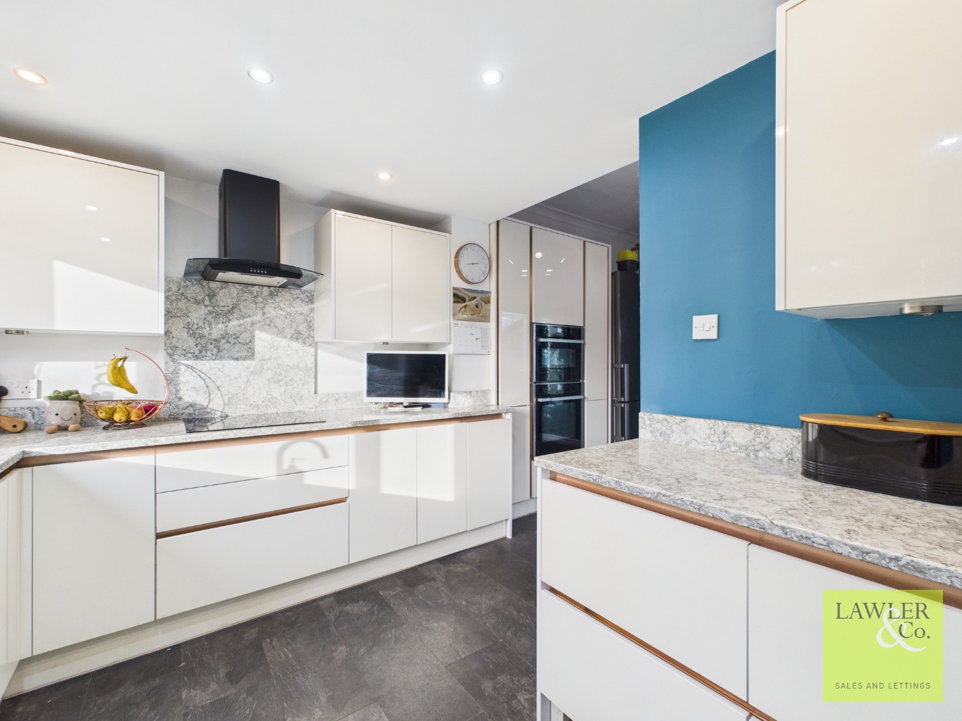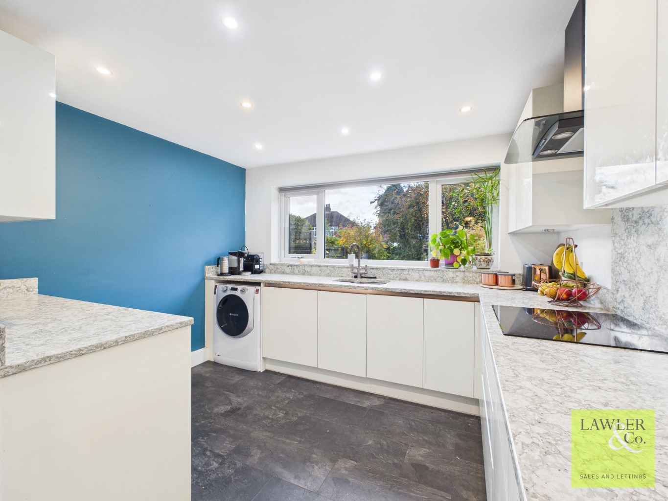 The extended L-shaped, stylish kitchen is thoughtfully designed, offering a generous range of eye and base level units, sleek worktops, and integrated appliances including a washing machine, double oven, induction hob, and extractor fan. With ample space for additional furniture and a convenient back door leading to the rear garden, it’s a practical yet inviting heart of the home. A downstairs shower room with a modern cubicle, WC, and hand wash basin completes the ground floor accommodation.