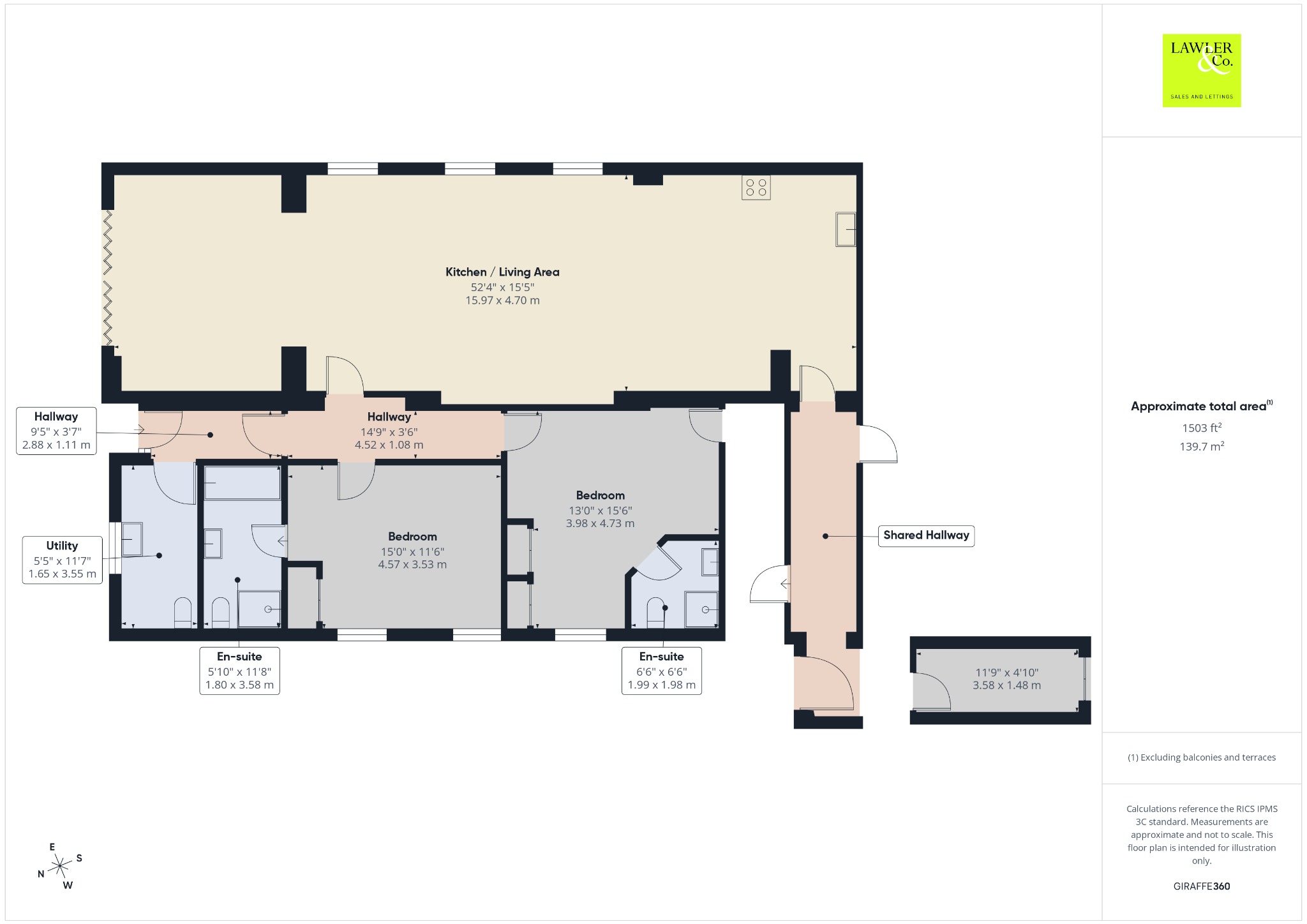 Bedroom one with integrated storage and a four piece en-suite bathroom including low level WC, sink, bath and shower. The second bedroom including two integrated storage areas with rails and a further shelved storage space. Completed by three piece en-suite including low level WC, sink and shower.