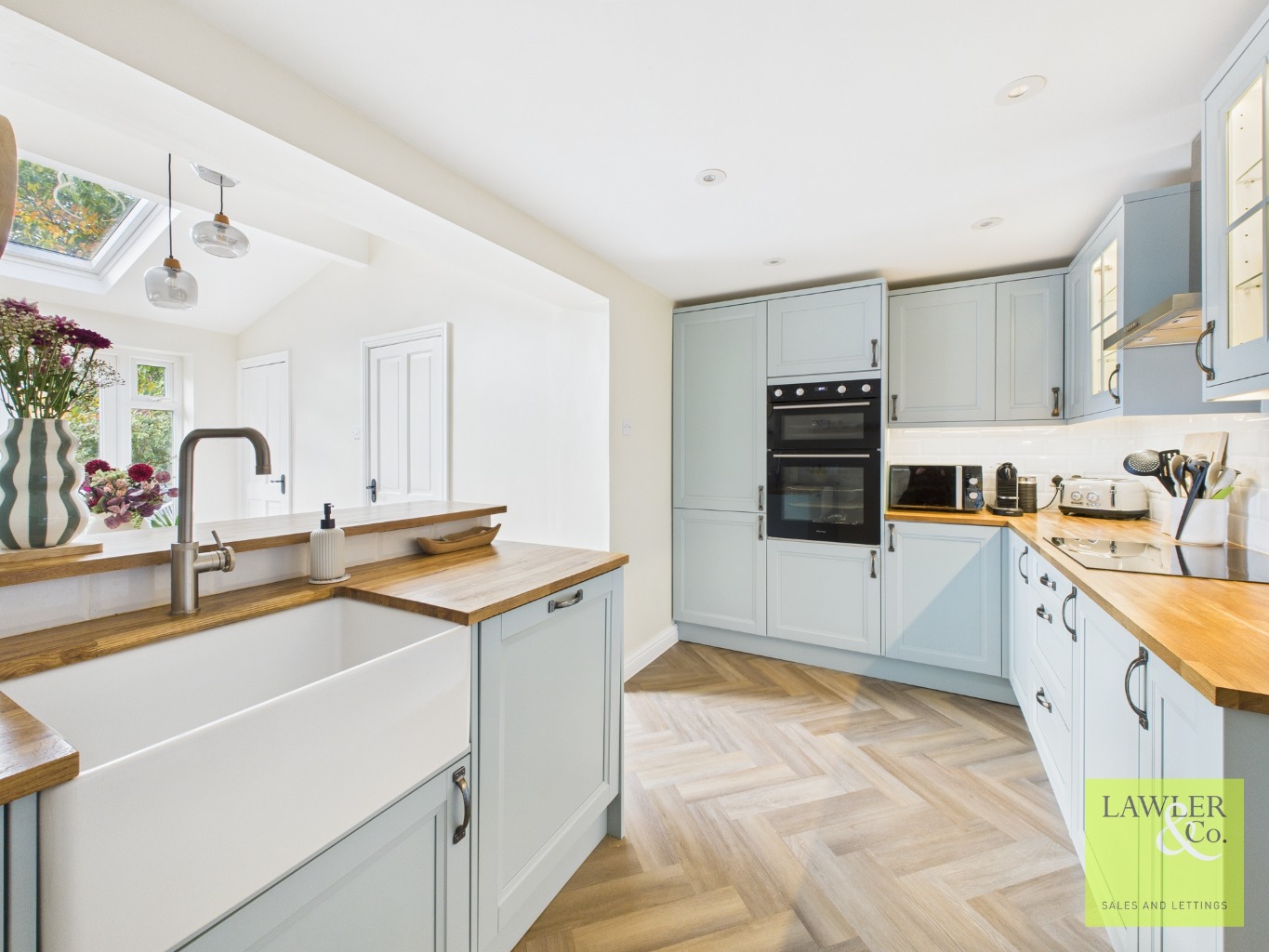Upon entry through the open porch, you are welcomed into a beautifully presented front living room. Featuring limestone tiled flooring complemented by the exposed brick feature wall, this home is filled with character and charm. A stylish log burner takes centre stage, filling the room with warmth for cosy evenings. Following through into the stunning open plan living, kitchen and dining area truly the heart of the home. Boasting LVT flooring throughout and a Velux window above the dining room allowing plenty of natural light to shine through. Offering contemporary style with modern eye and base level units and high quality appliances including a double oven, fridge/freezer, Hotpoint dishwasher, Belfast style sink and induction hob with extractor. Adding to its versatility, the home also benefits from an additional lounge area- with French patio doors leading out onto the south facing garden. The property offers a further lounge space for versatility and French patio doors out on the south facing garden. Completing the ground floor is a convenient downstairs WC, a utility area with space for white goods, and internal access to the attached garage.