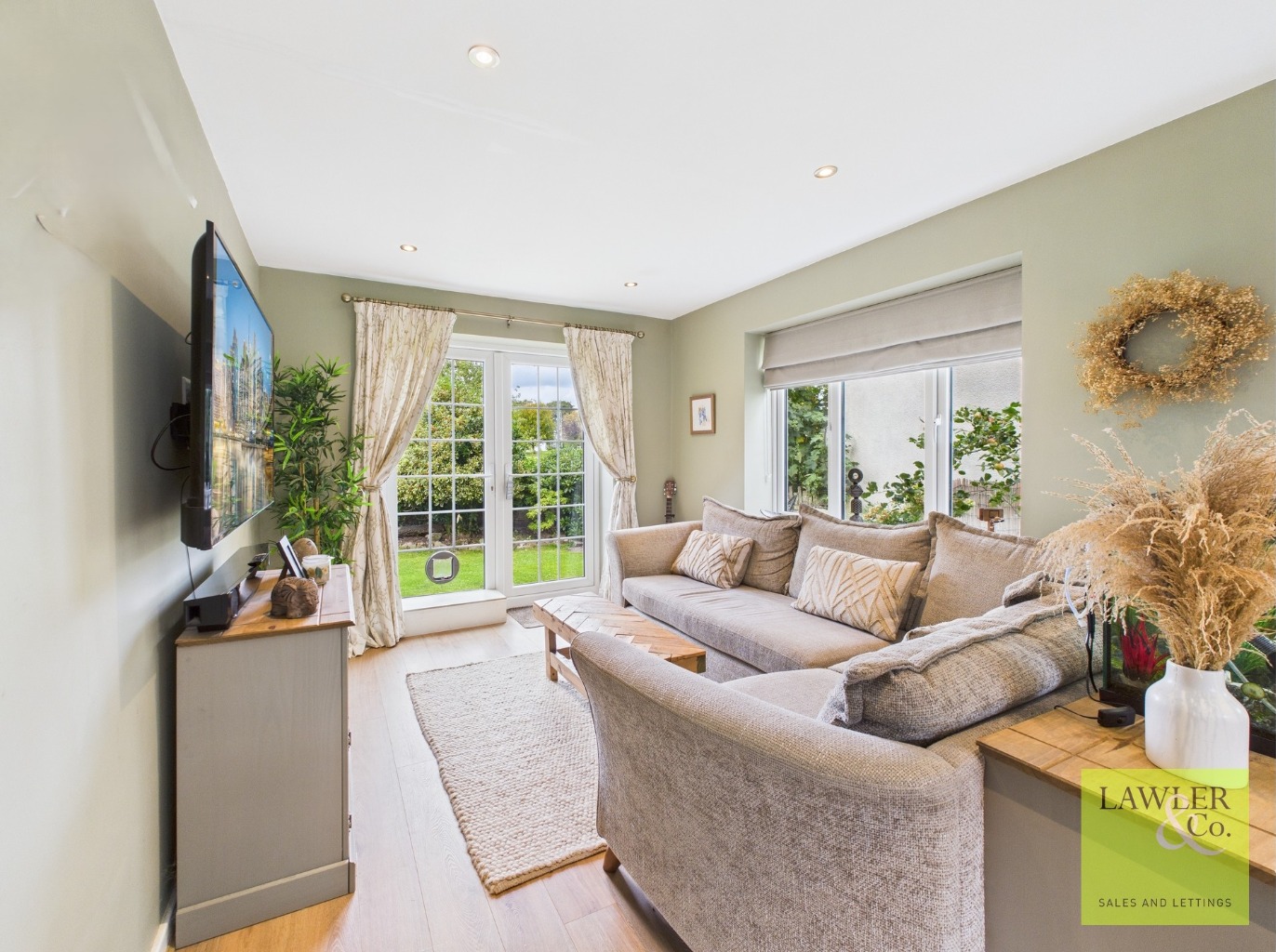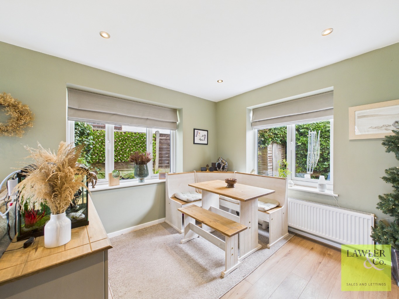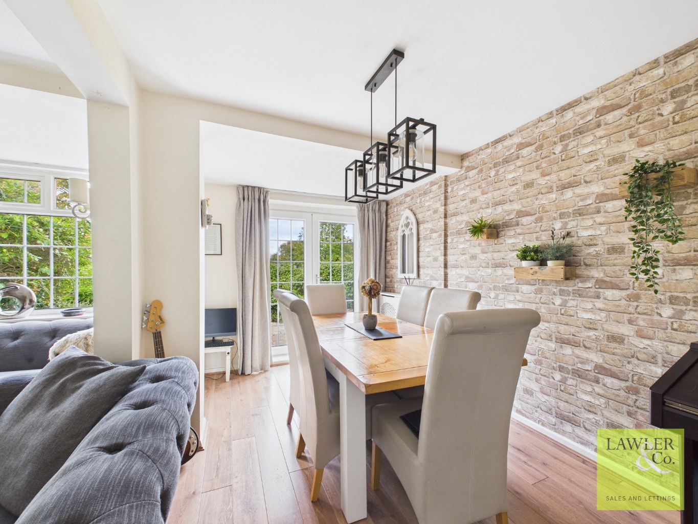 On entering this lovely home your are greeted by the welcoming hallway with handy downstairs WC and warm wood effect laminate flooring that flows through the downstairs space. The open plan kitchen has a good range of cream units with wood effect work surfaces over with space for a Belling ‘Rangemaster style’ gas and electric oven, extractor hood, washing machine, integrated dishwasher and fridge freezer The kitchen is open to a breakfast dining area and comfortable seating space for relaxing with french doors overlooking the garden and is great living space for a bustling family. There is a further spacious lounge/ dining room with a feature modern gas fire and ample space for a family dining table and more French doors out to the patio.