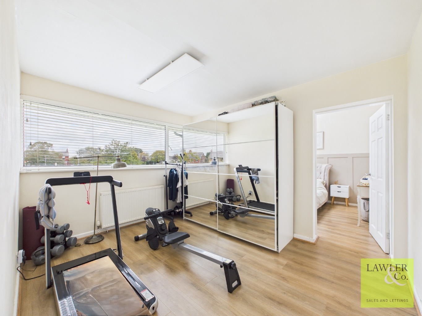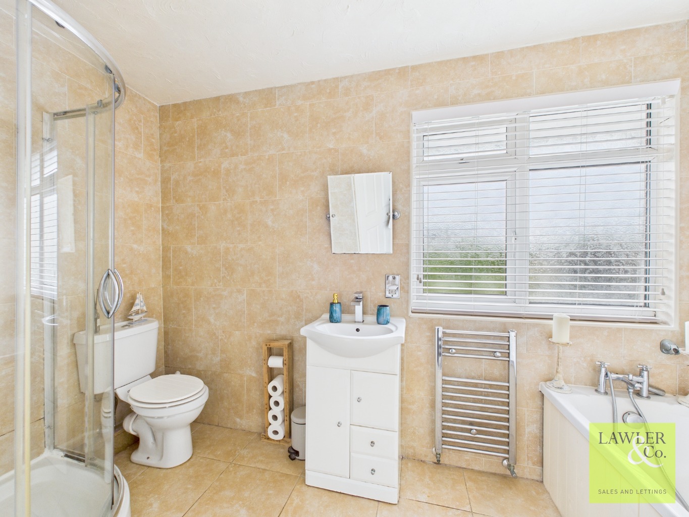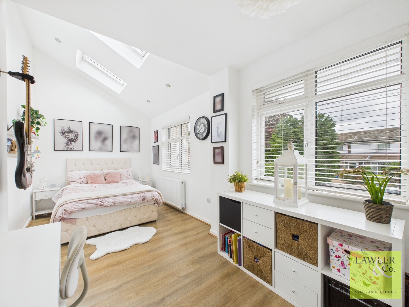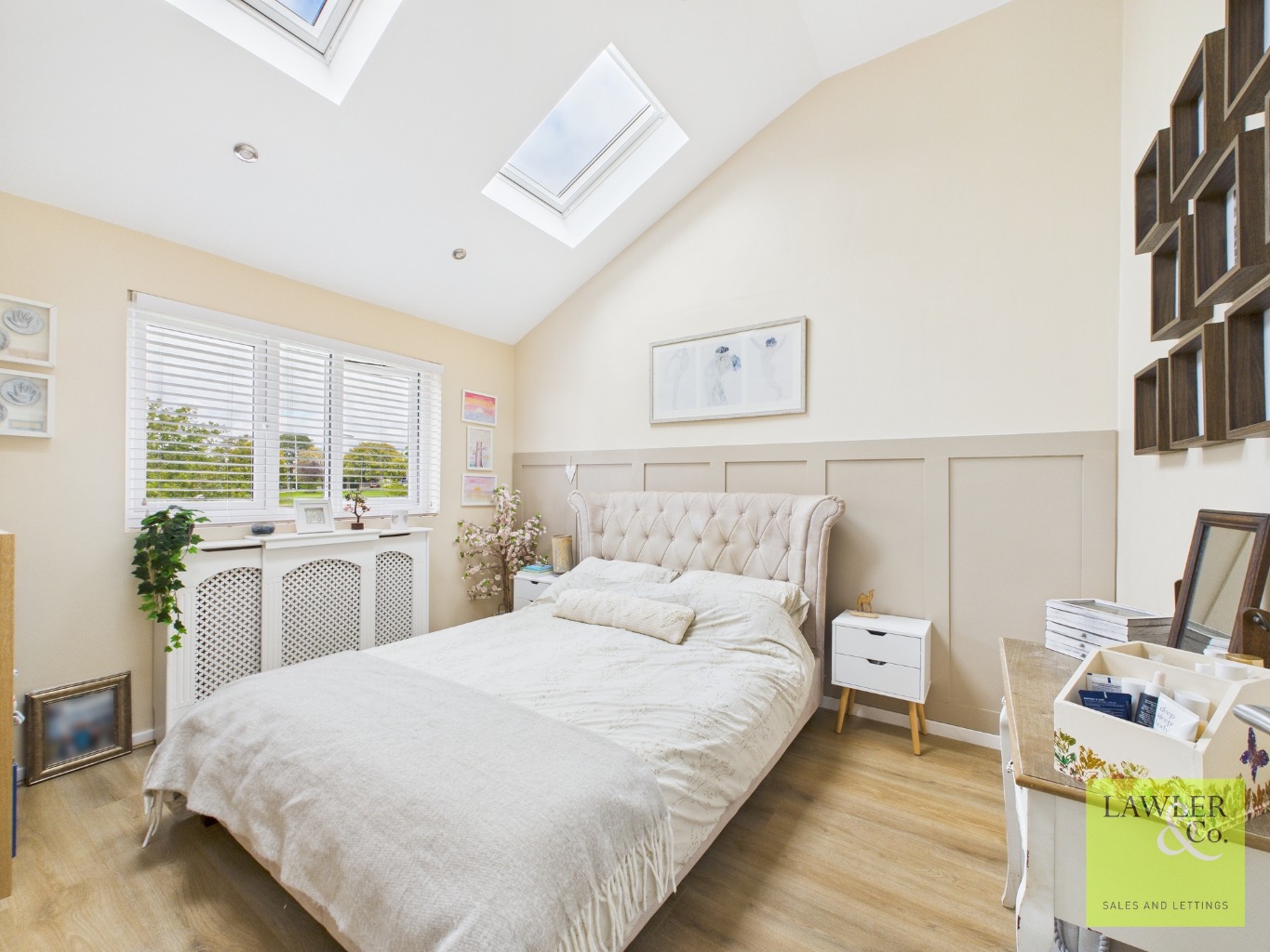 To the first floor finds three spacious double bedrooms. The master bedroom has a dressing room attached which has fitted wardrobes and is also currently used as a gym. This could be easily partitioned off to create a fourth bedroom or office. The second double is of a generous size and as with the master has a high vaulted ceiling with Velux windows providing plenty of natural light in. The third bedroom is also a double and overlooks The Green area behind. The well appointed bathroom is fully tiled and comprises of a corner shower enclosure, WC, vanity sink unit, bath, heated towel rail and storage cupboard.