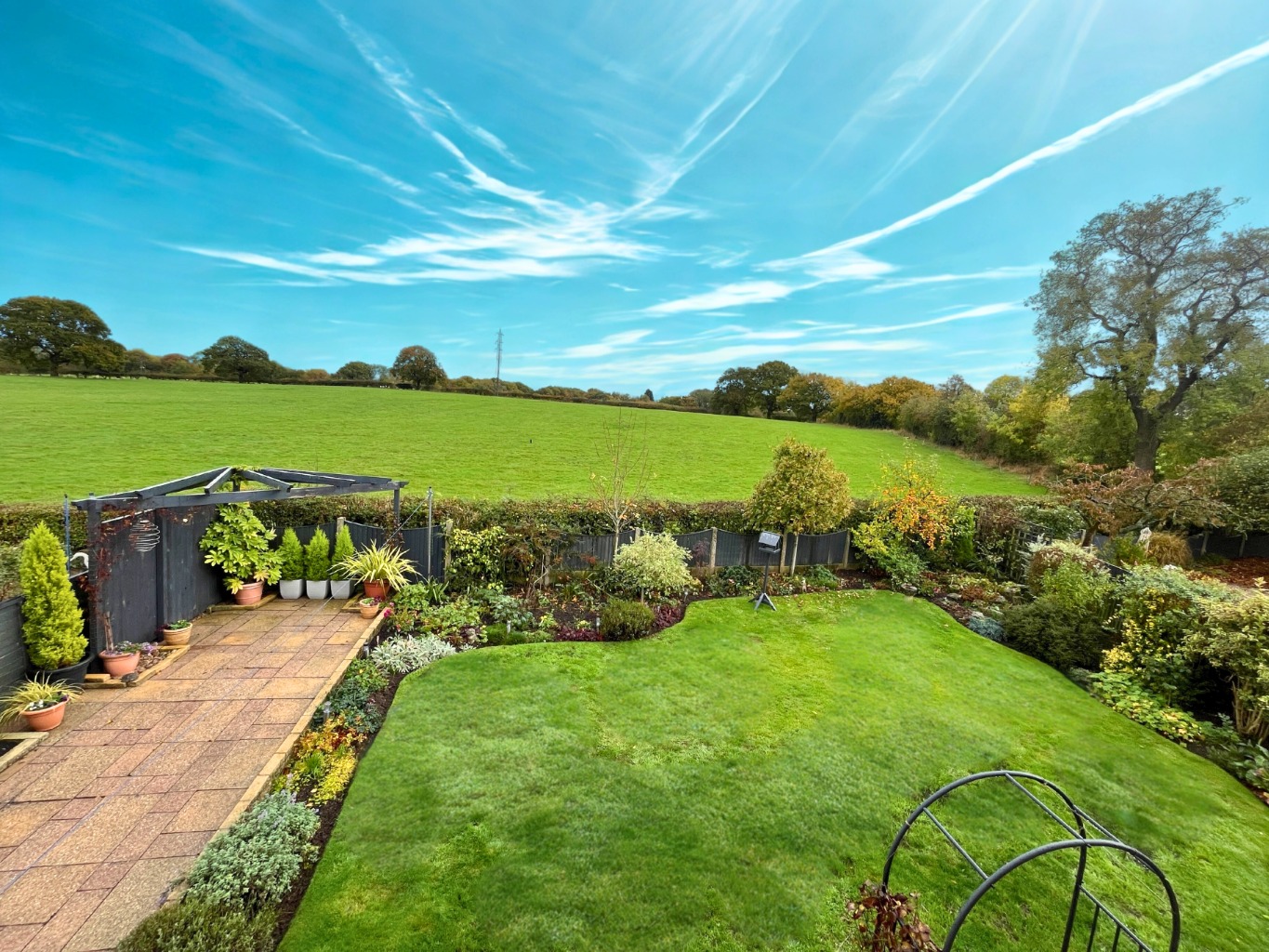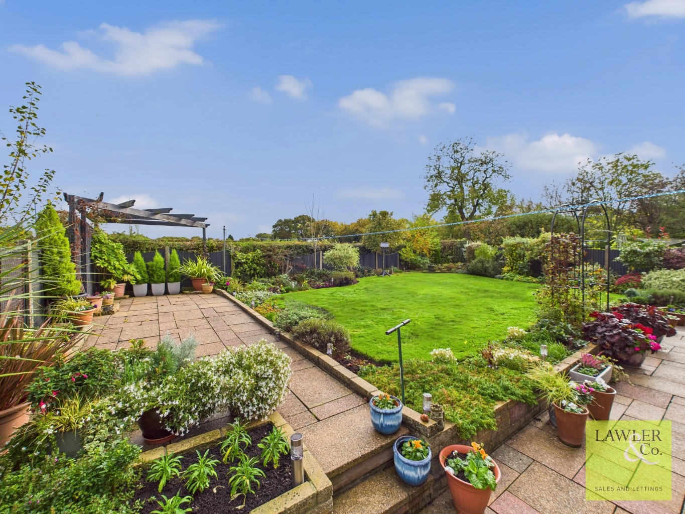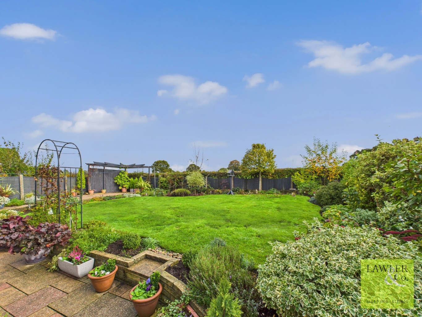 Outside, the rear garden is beautifully maintained and includes a paved patio, pergola seating area, and mature shrubs, offering a private and peaceful outdoor space. To the front, a large driveway provides off-road parking for several vehicles.
