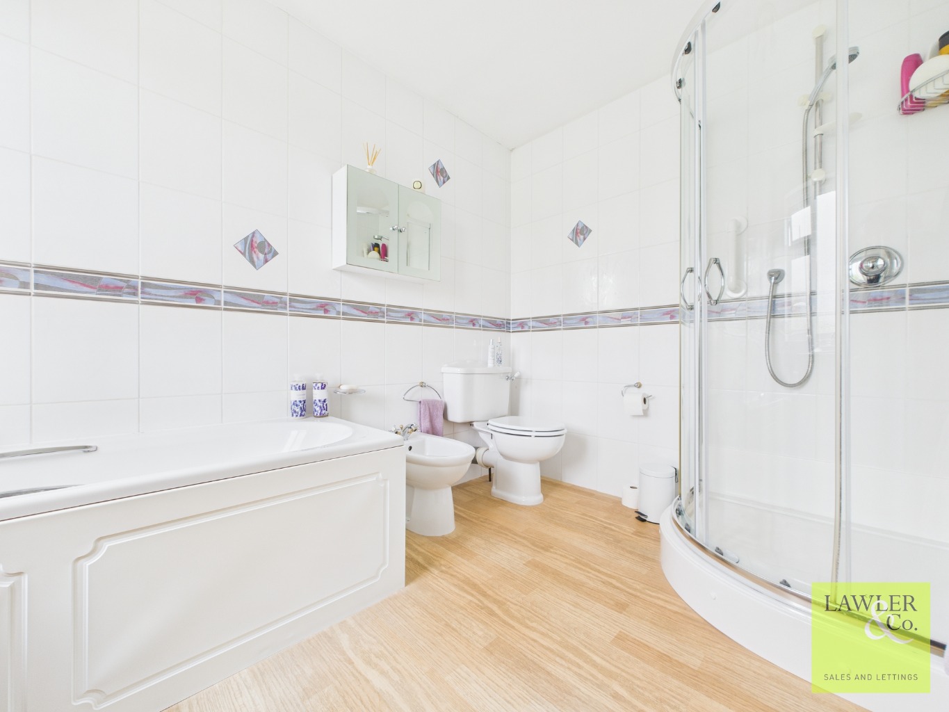 Upstairs, the home offers four sizeable bedrooms. The main bedroom is exceptionally spacious and benefits from extensive built-in wardrobes, a dressing area, and views over the rear garden. It also enjoys a luxurious five-piece en-suite bathroom, complete with a bath, shower cubicle, bidet, WC, and hand wash basin. The three further bedrooms also feature built-in storage and benefit from a tastefully tiled family bathroom with a bath and overhead shower.