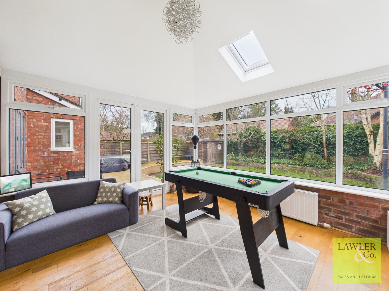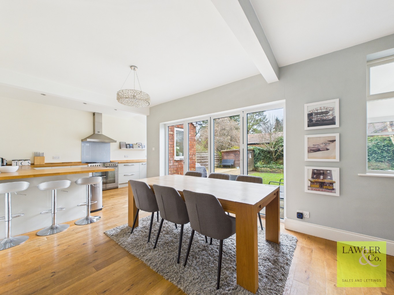 At the heart of the home lies the show-stopping open-plan kitchen, dining and living area, complete with underfloor heating. The kitchen is fitted with a stylish range of base-level units, a breakfast bar, and an array of integrated appliances including a dishwasher and extractor fan, complemented by a stunning range cooker.The dining area benefits from beautiful bi-folding doors, opening directly onto the decked seating area and allowing natural light to pour in, seamlessly blending indoor and outdoor living.The living area is warm and welcoming, featuring a beautiful log burner and access through to the orangery. This exceptional additional reception space is ideal for entertaining, with a Velux window and doors opening out to the rear garden.