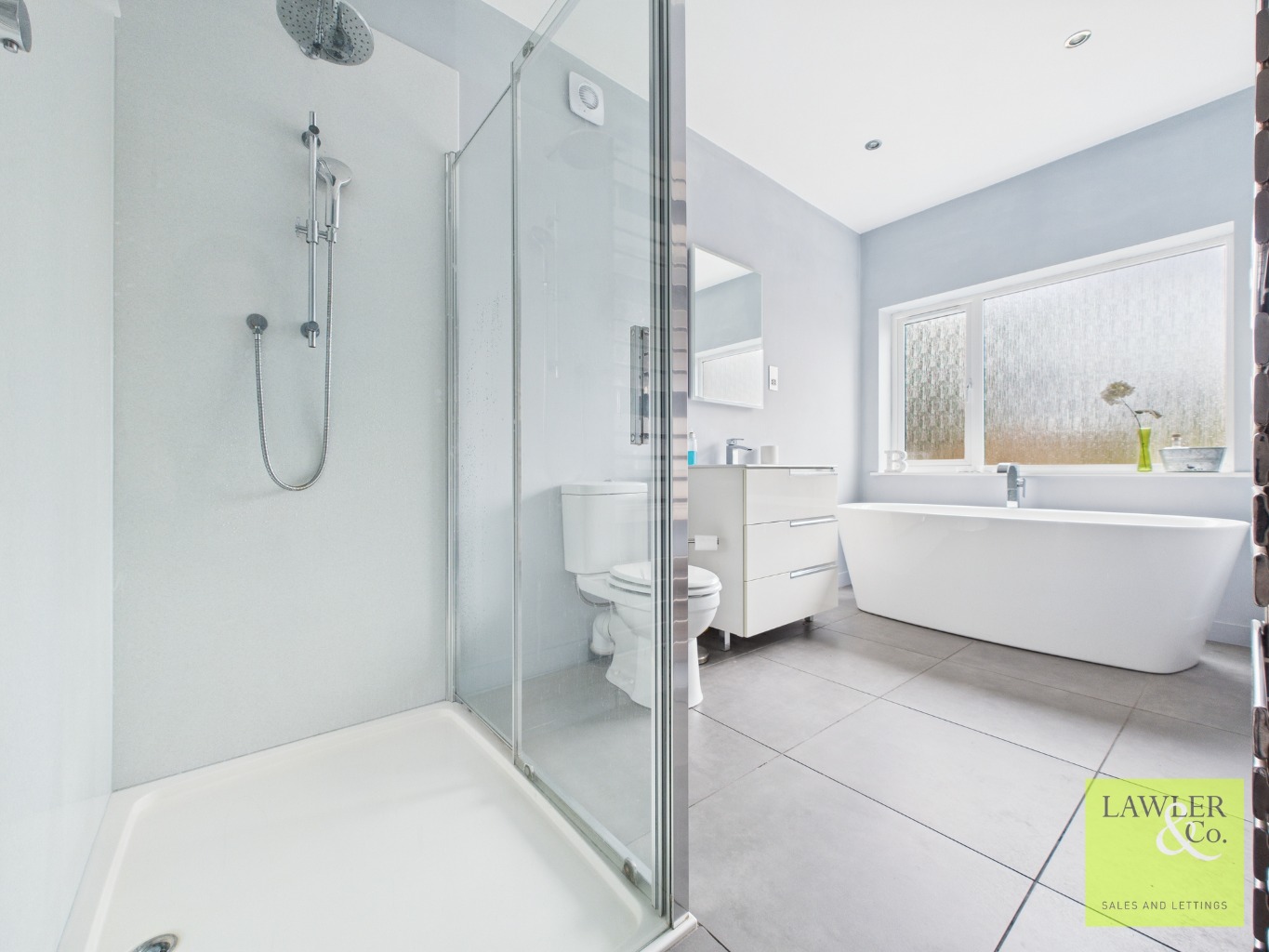To the first floor, the property offers four generously proportioned double bedrooms, all flooded with natural light. The Master bedroom benefits from a modern en-suite, complete with a walk-in shower, WC and handwash basin.The stylish four-piece family bathroom comprises a freestanding bathtub, walk-in shower, vanity unit, WC, finished to a high standard and offers underfloor heating!