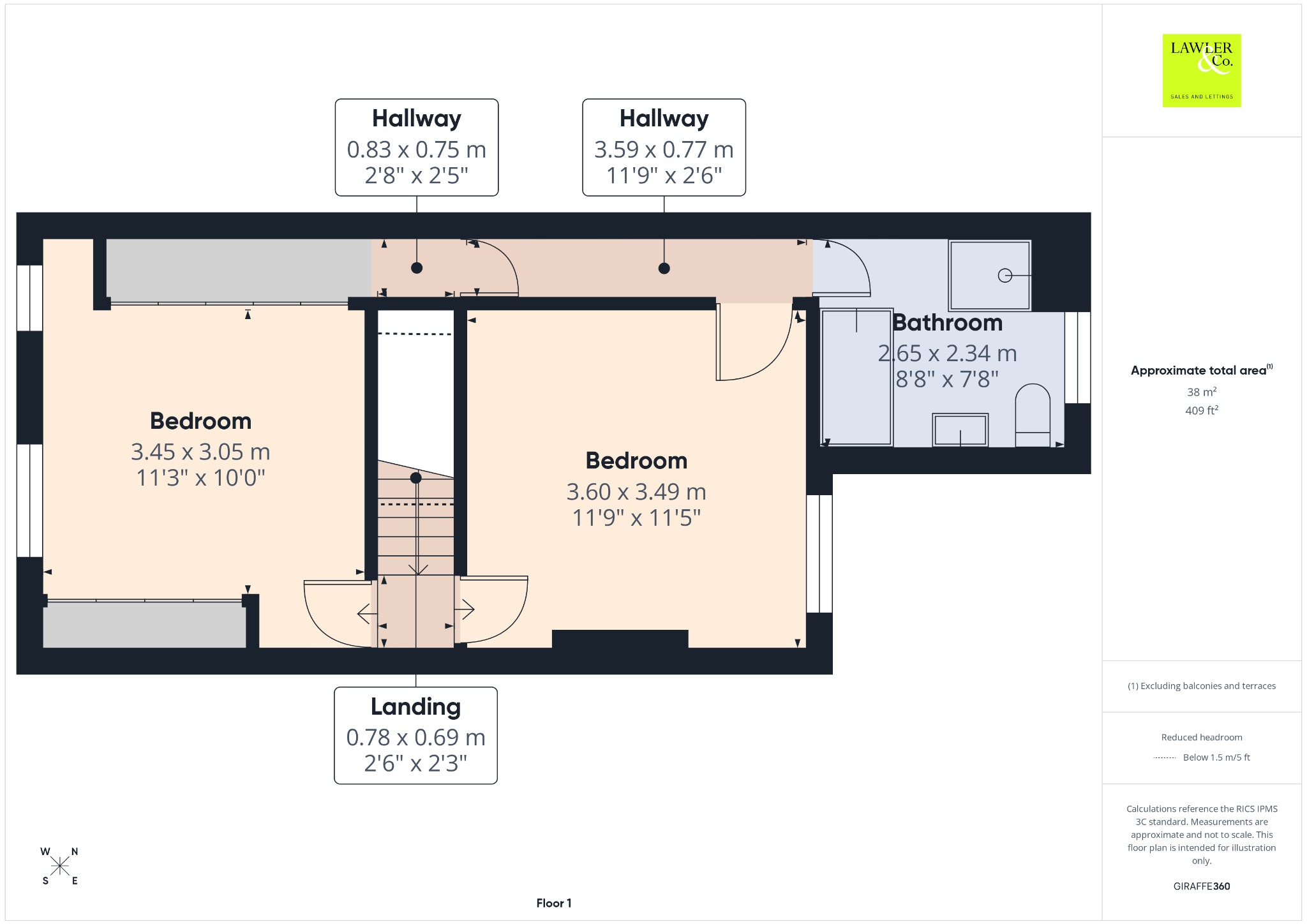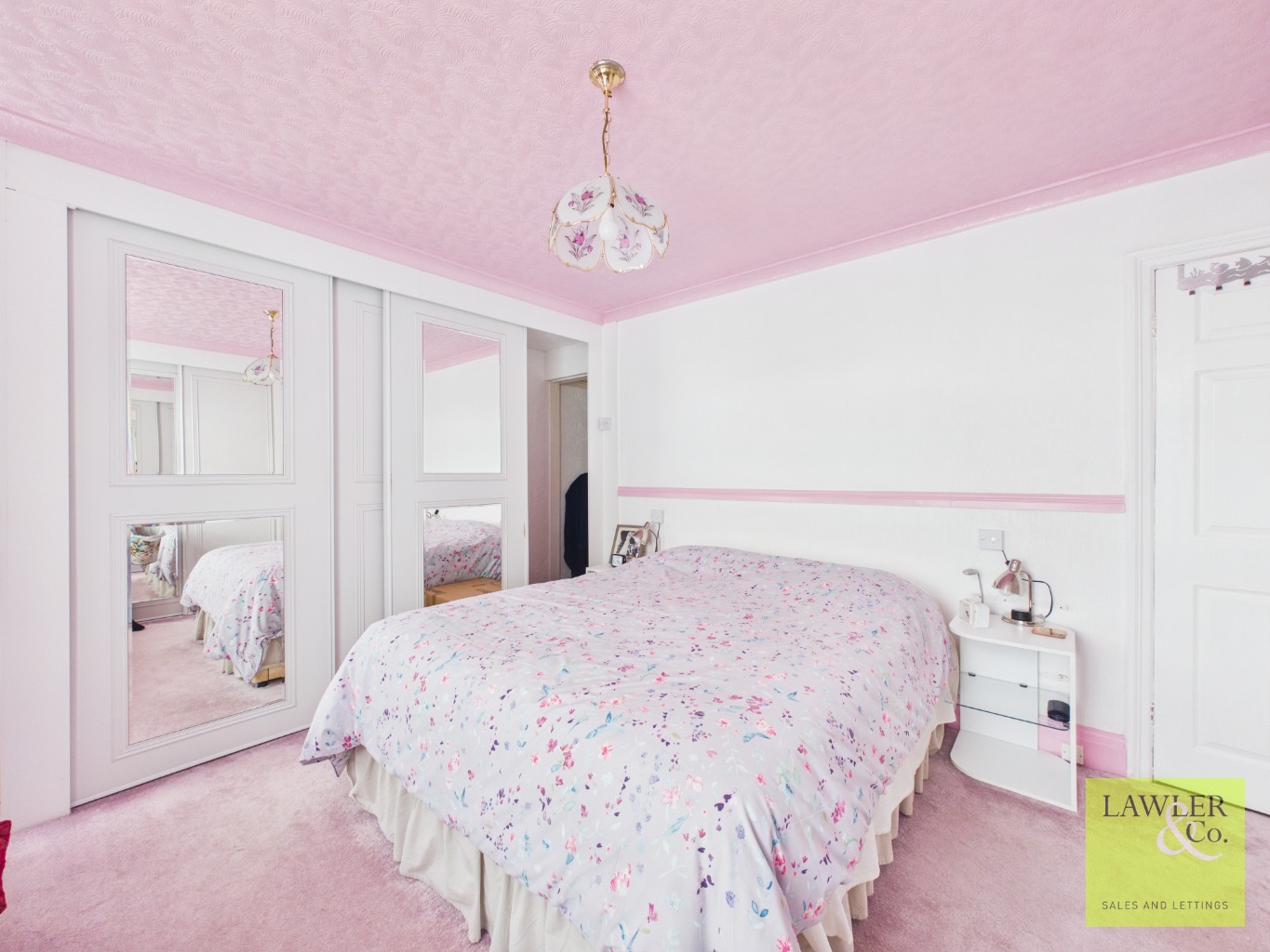 The first-floor landing provides access to two generously sized double bedrooms. The rear bedroom enjoys views over the private garden, while the front bedroom benefits from dual-aspect windows and fitted sliding wardrobes. A cleverly concealed entrance from the wardrobe to the hallway leads to the main bathroom, a well-appointed four-piece suite featuring a walk-in shower, corner bath, WC, and wash basin, conveniently accessed by both bedrooms.