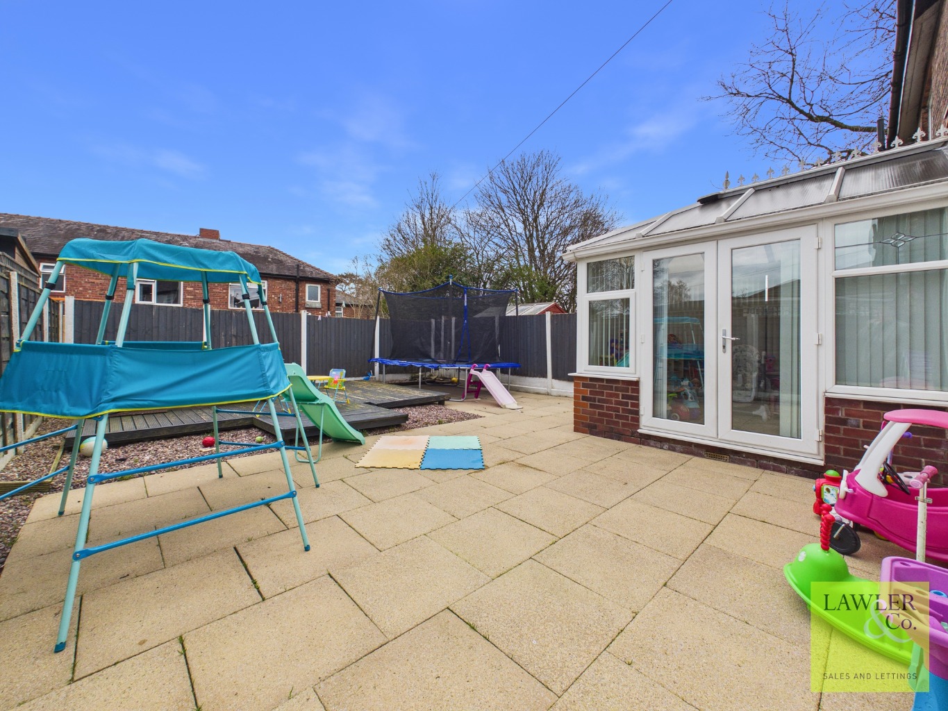 Outside, the garden has been designed for low maintenance while still offering a fantastic space for family life. With a combination of decking and paved areas, it’s perfect for outdoor dining, summer barbecues, and children playing safely. There is also convenient side access and an outside tap. The current owners have set up their children’s climbing frames and outdoor play equipment here, which really helps showcase how the garden can be enjoyed as a fun, family-friendly space where kids can play while parents relax nearby.
