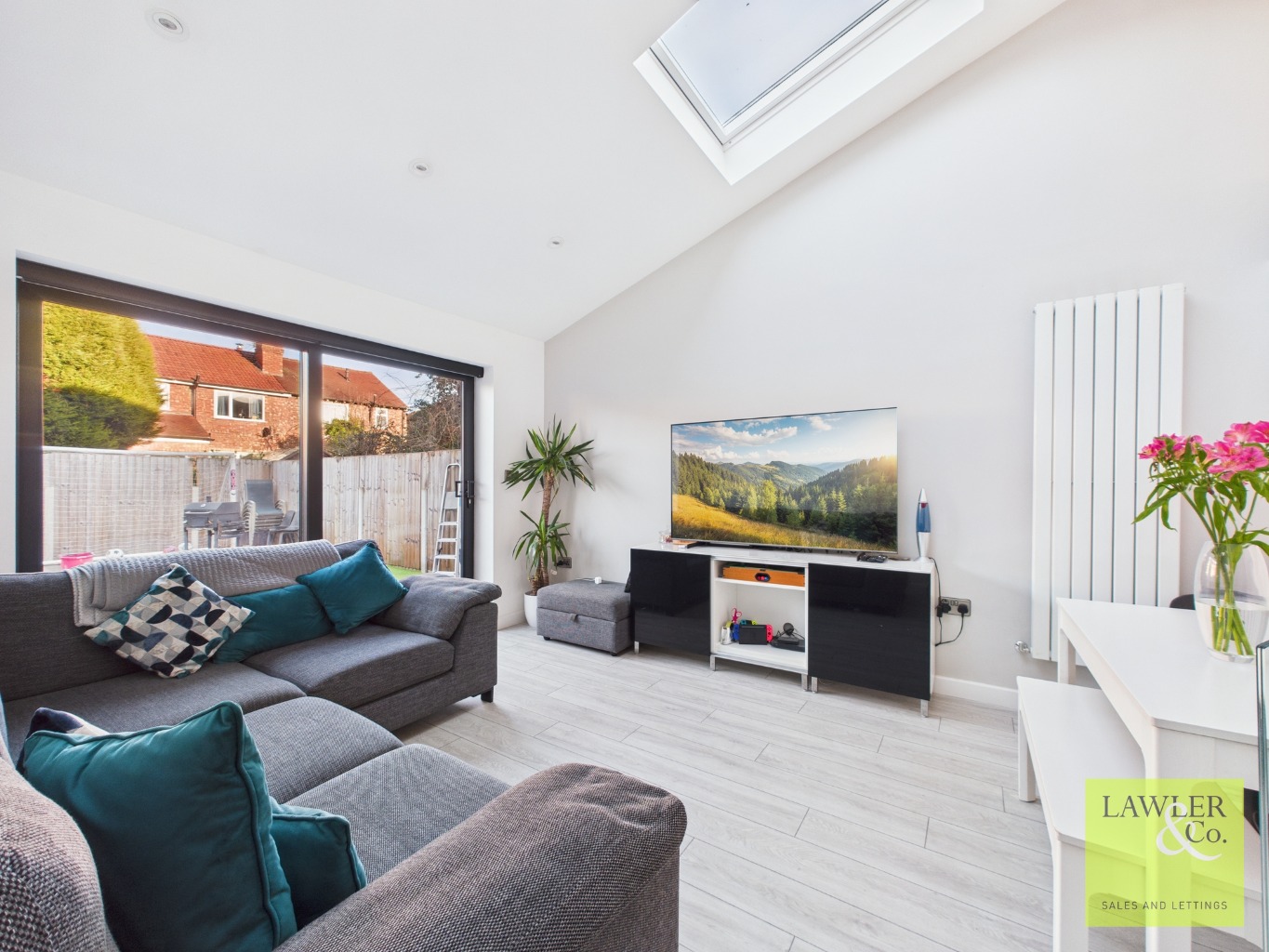 The gorgeous front lounge sets the tone beautifully, featuring a striking fireplace as its focal point and pleasant views to the front, offering the perfect space to relax. However, the real show-stopper is the spectacular open-plan, split-level kitchen, dining and living area—undeniably the heart of the home and guaranteed to impress. You are welcomed into a sleek, modern kitchen fitted with stylish eye and base units, integrated fridge/freezer, dishwasher, oven, induction hob and extractor fan, all finished to an exceptional standard and complemented by a contemporary breakfast bar and access to the cellar. Steps lead down into the extended split-level lounge/diner, where Velux windows and expansive bi-folding doors flood the space with natural light, seamlessly connecting the indoors with the rear garden and providing an abundance of space for entertaining, dining and everyday living.