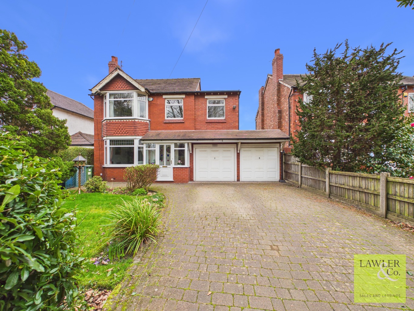 Upon entering through the gated driveway and a welcoming porch, you are greeted by a spacious hallway adorned with charming stained-glass windows and a practical under-stairs cupboard—perfect for additional storage. The bright and generously sized living room sits to the front of the home, featuring an elegant bay window, decorative coving and an electric fireplace that creates a warm and inviting focal point. To the rear, the equally spacious dining room offers another delightful box bay window, decorative coving and a gas fire framed by attractive stone surrounds, making it an ideal setting for family gatherings and entertaining. The breakfast room provides a cosy everyday dining space and includes a unique sliding serving hatch along with a patio door that opens directly onto the beautiful rear garden. The partially tiled kitchen is well-equipped with Bosch and Zanussi appliances including an electric oven, fridge, freezer, washing machine and dryer. Another patio door leads conveniently out to the garden, while internal access from the kitchen takes you directly into the double garage—adding both practicality and ease to daily living and offering ideal extra storage space.