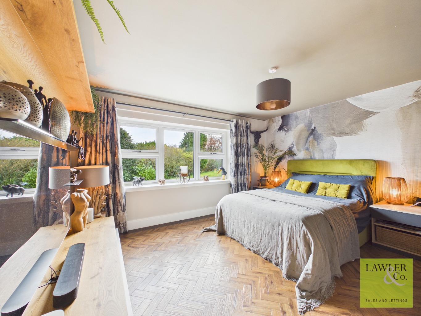 Inside, the home opens into a spacious entrance hallway with Karndean Herringbone Oak floor that spans into the second reception and living areas. The living room features dual-aspect windows and doors that flood the room with natural light and includes a 9KW log burner with a built-in media unit for a cozy, modern aesthetic. The kitchen/dining area boasts luxury Dekton worktops and Neff appliances blending elegance with functionality. The tastefully designed shower room with dual sinks offers functionality for guests while the utility room offers additional storage, workspace and leads to the rear patio. The ground floor also boasts a spacious bedroom suite with fitted wardrobes that leads into a luxury four piece fully tiled en-suite.