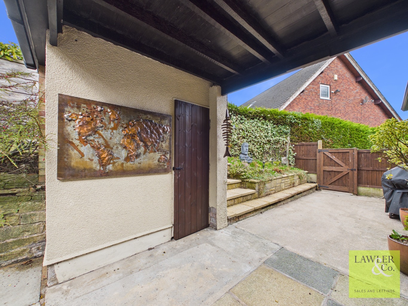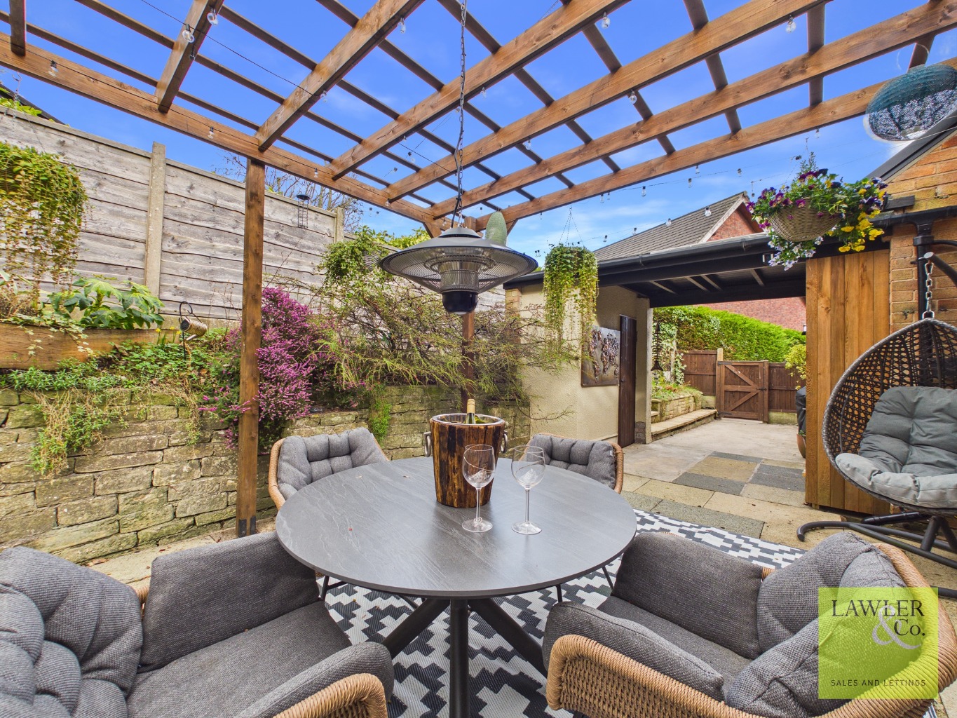 Upon arrival at the property, you are greeted by wrought iron electric gates with a top-of-the-range intercom system enhancing both privacy and security and a long sloping driveway offering parking for up to 8 cars. The surrounding gardens encase the home with mature shrubbery and trees, creating a private environment. The views stretch out across Mellor’s rolling hills and beyond.