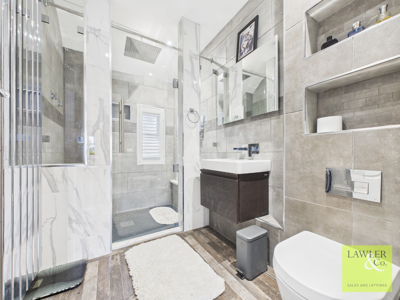 To the first floor a spacious landing provides access to three generously sized double bedrooms, all thoughtfully designed with dual aspect windows allowing plenty of natural light. The spacious main bedroom offers a true retreat with a stylishly finished en-suite, complete with a contemporary walk in shower enclosed by a sleek glass door, vanity sink and a low level WC. A walk in wardrobe adds a touch of everyday luxury. The second bedroom also offers a tastefully tiled en-suite, complete with walk in shower, WC and sink as well as fitted wardrobes. Complete with a stunning four piece bathroom suite, finished to an exceptional standard. It boasts a freestanding bath, a walk in rainfall shower, a low level WC and a floating vanity sink creating a spa-like retreat.
