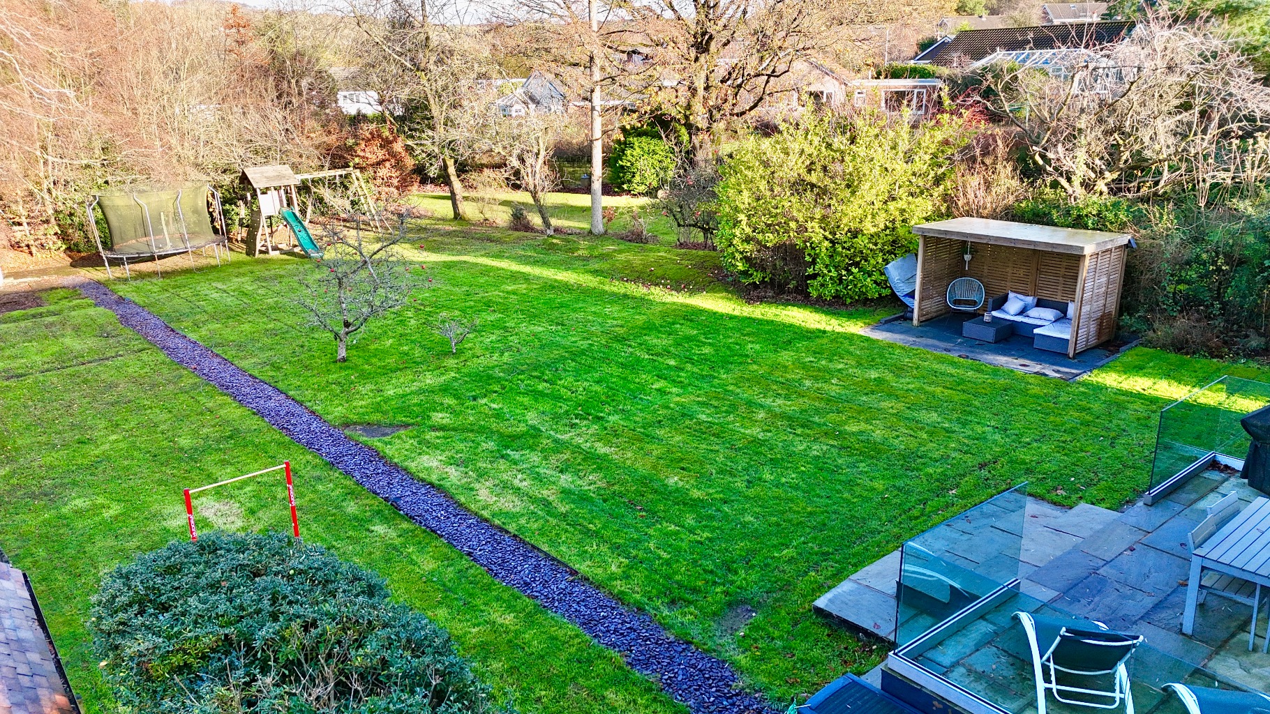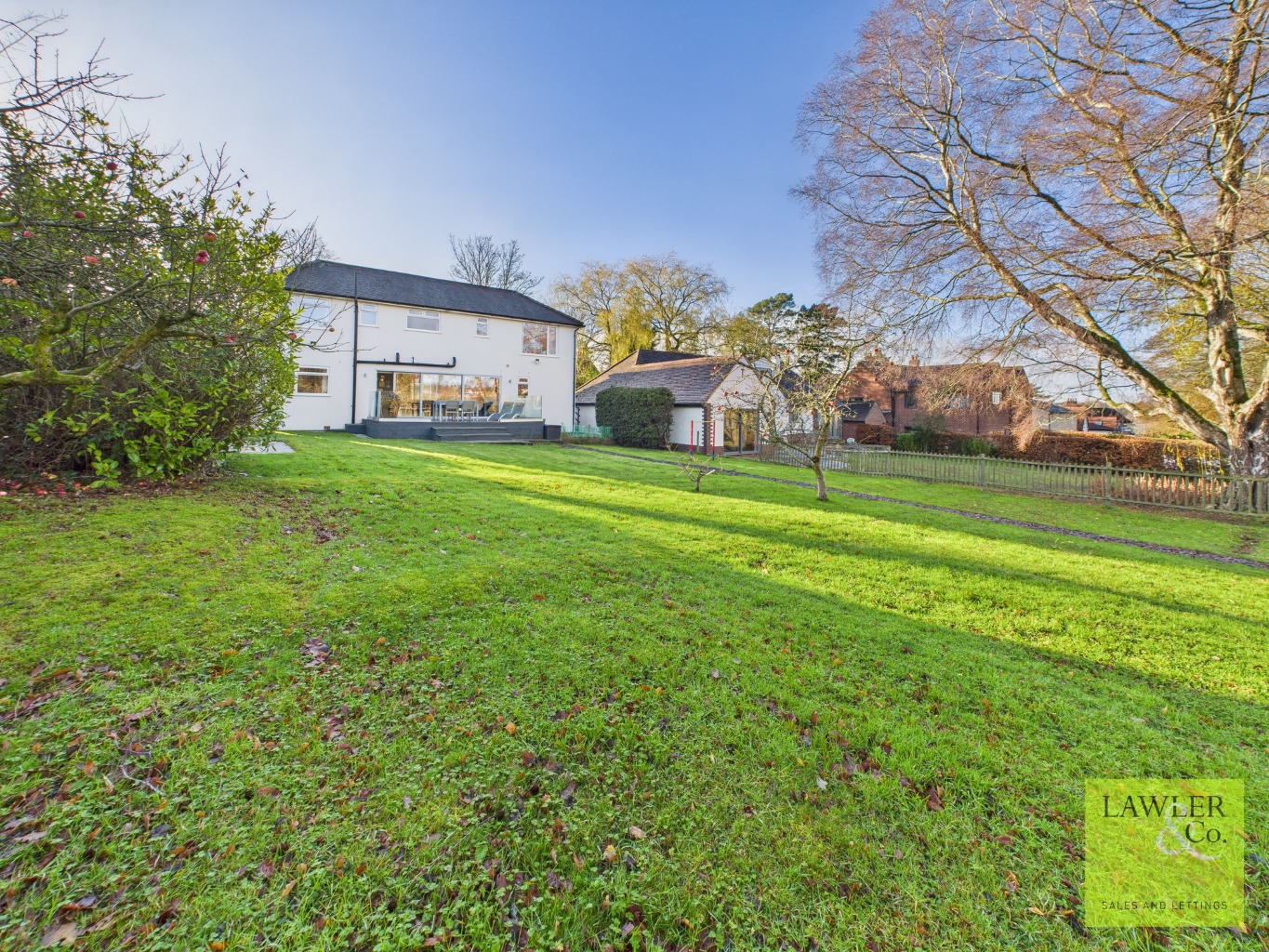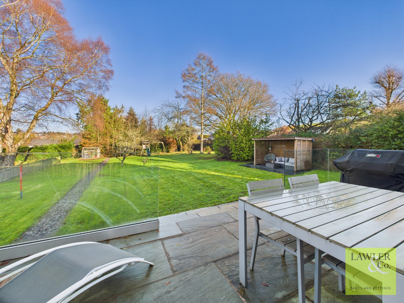 The substantial rear garden is mainly laid to lawn and features two generous paved areas—perfect for hosting gatherings, socialising, or simply enjoying an evening drink. The outdoor space is further enhanced by three apple trees, two rhododendron bushes and a variety of other established planting, creating a lovely natural backdrop. To the front of the property, a sizeable gravel driveway offers ample off-road parking for several vehicles with access to the garage, adding convenience for both residents and guests.