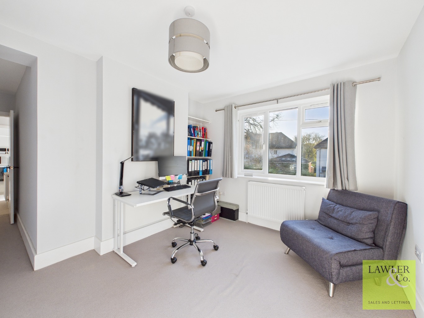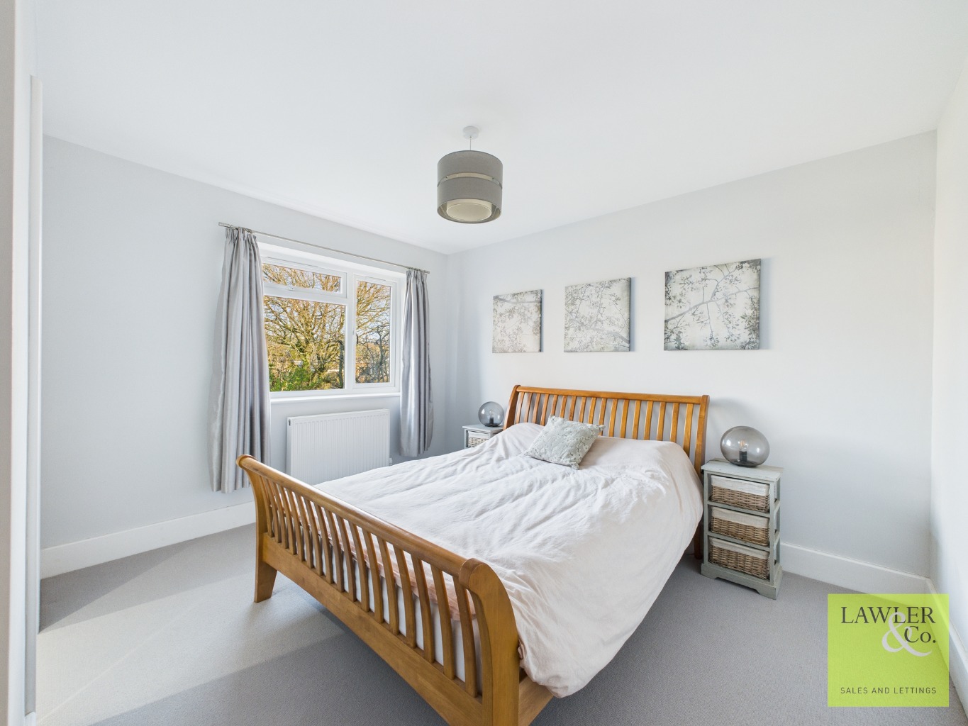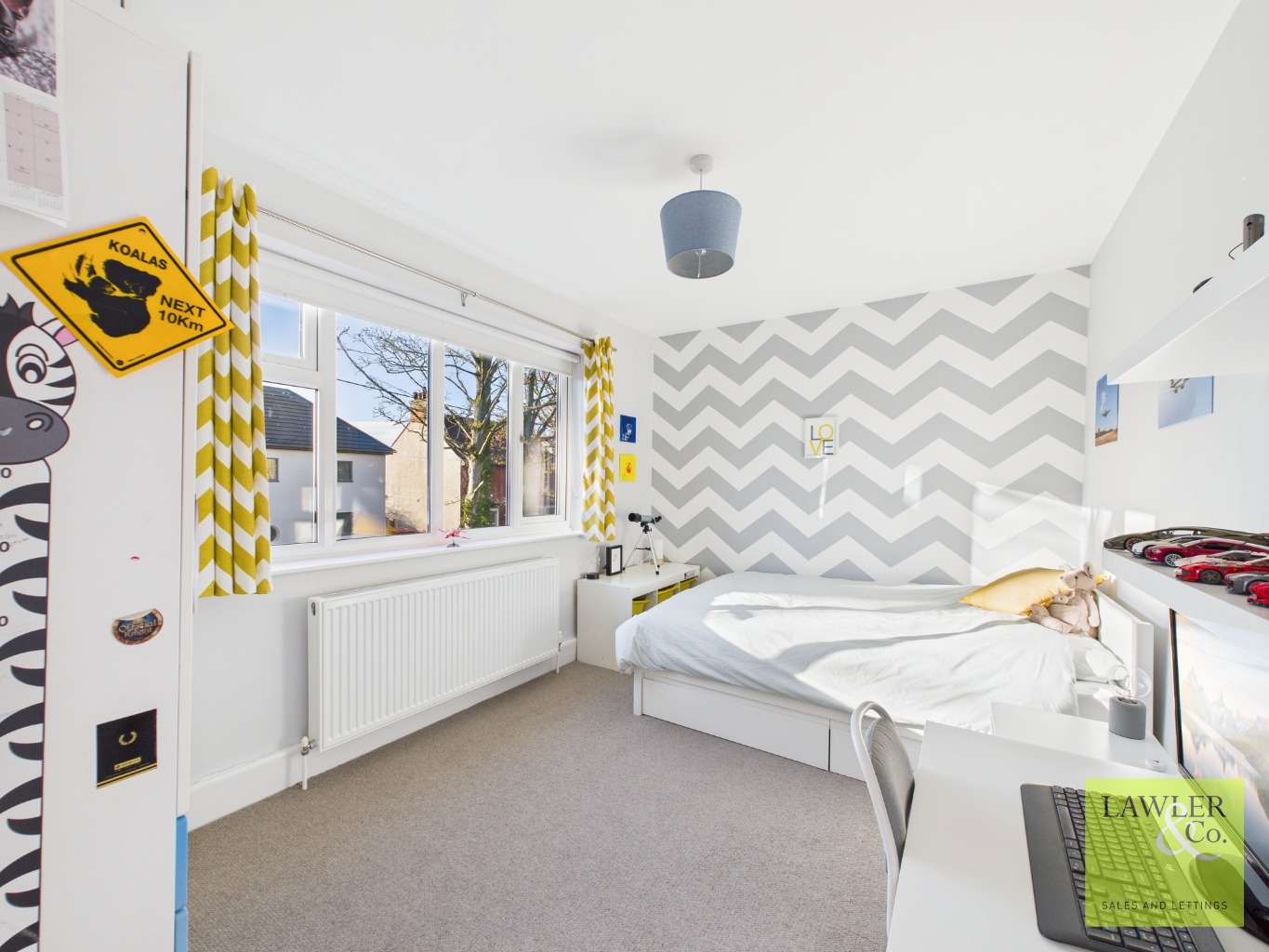 The substantial rear garden is mainly laid to lawn and features two generous paved areas—perfect for hosting gatherings, socialising, or simply enjoying an evening drink. The outdoor space is further enhanced by three apple trees, two rhododendron bushes and a variety of other established planting, creating a lovely natural backdrop. To the front of the property, a sizeable gravel driveway offers ample off-road parking for several vehicles with access to the garage, adding convenience for both residents and guests.