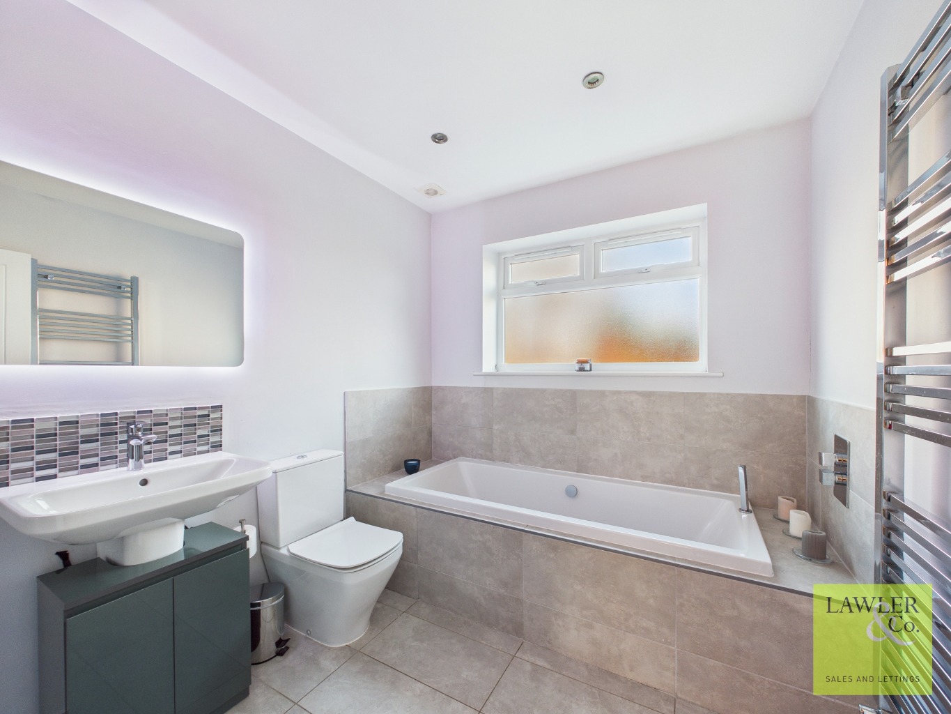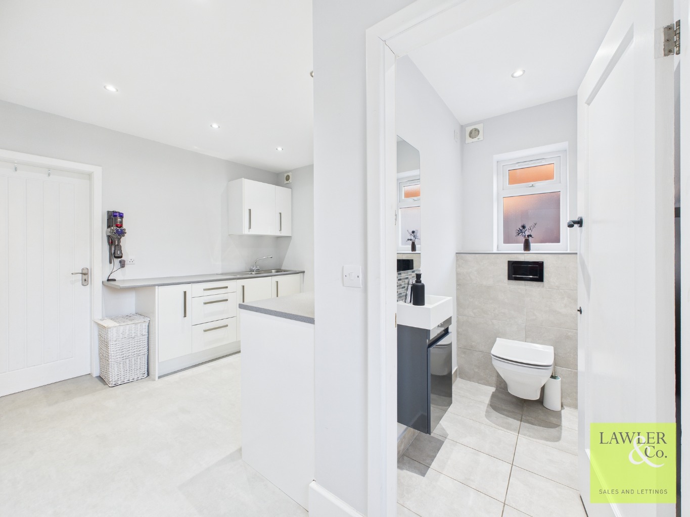 Enter through the traditional wooden front door into a generous hallway enhanced with decorative coving and benefiting from a useful storage cupboard tucked neatly beneath the stairs. The real highlight of the home is the impressive open-plan kitchen and dining area. Designed with both style and practicality in mind, it features sleek matching wall and base units, a composite sink, Samsung fridge/freezer, Beko dishwasher and a Bosch electric oven and hob, complemented by an additional gas hob and extractor. At the centre of the room sits a striking island, finished with a walnut worktop. One side offers push-to-open, soft-close drawers, while the opposite side forms a welcoming breakfast bar—perfect for casual dining. There is ample room for a dining table and a relaxed seating area, made especially cosy by a log burner at the front of the kitchen. Sliding doors lead out to the substantial rear garden, allowing natural light to pour in and providing lovely views. Toward the back of the home, a comfortable snug offers another peaceful living space overlooking the garden. A discreet hideaway door reveals the utility room, equipped with a CDA electric oven, Beko washing machine and dryer and providing access to both the garage and the garden. A convenient downstairs WC is also located here, partially tiled and fitted with a vanity wash basin, heated towel rail, and WC. The living room completes the ground floor and features a tasteful electric fireplace, decorative coving and traditional picture rails creating a warm and elegant atmosphere.