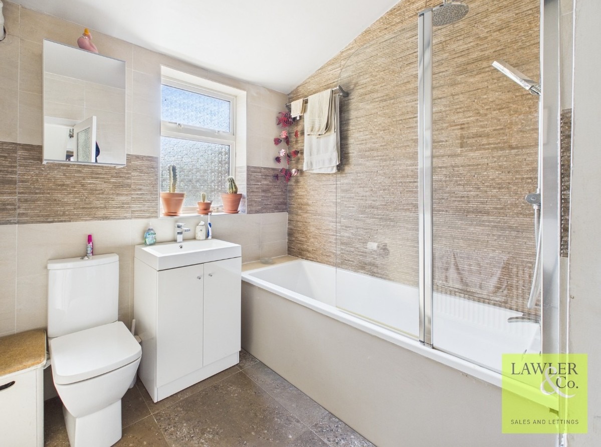 The attractive fully tiled family bathroom comprises; modern white three-piece suite including a large bath with overhead rainfall shower head, vanity sink with mixer tap, WC and a built-in storage cupboard.