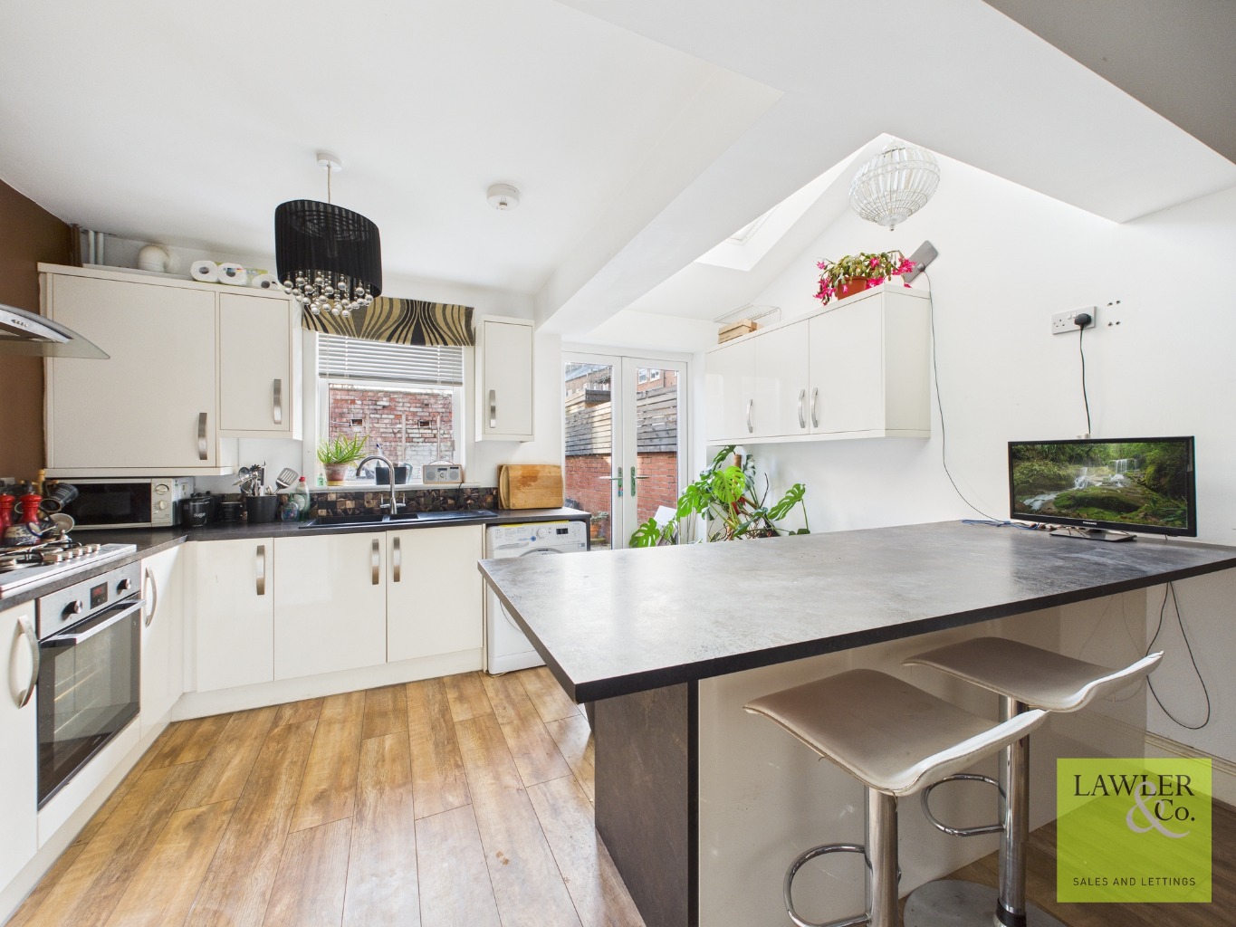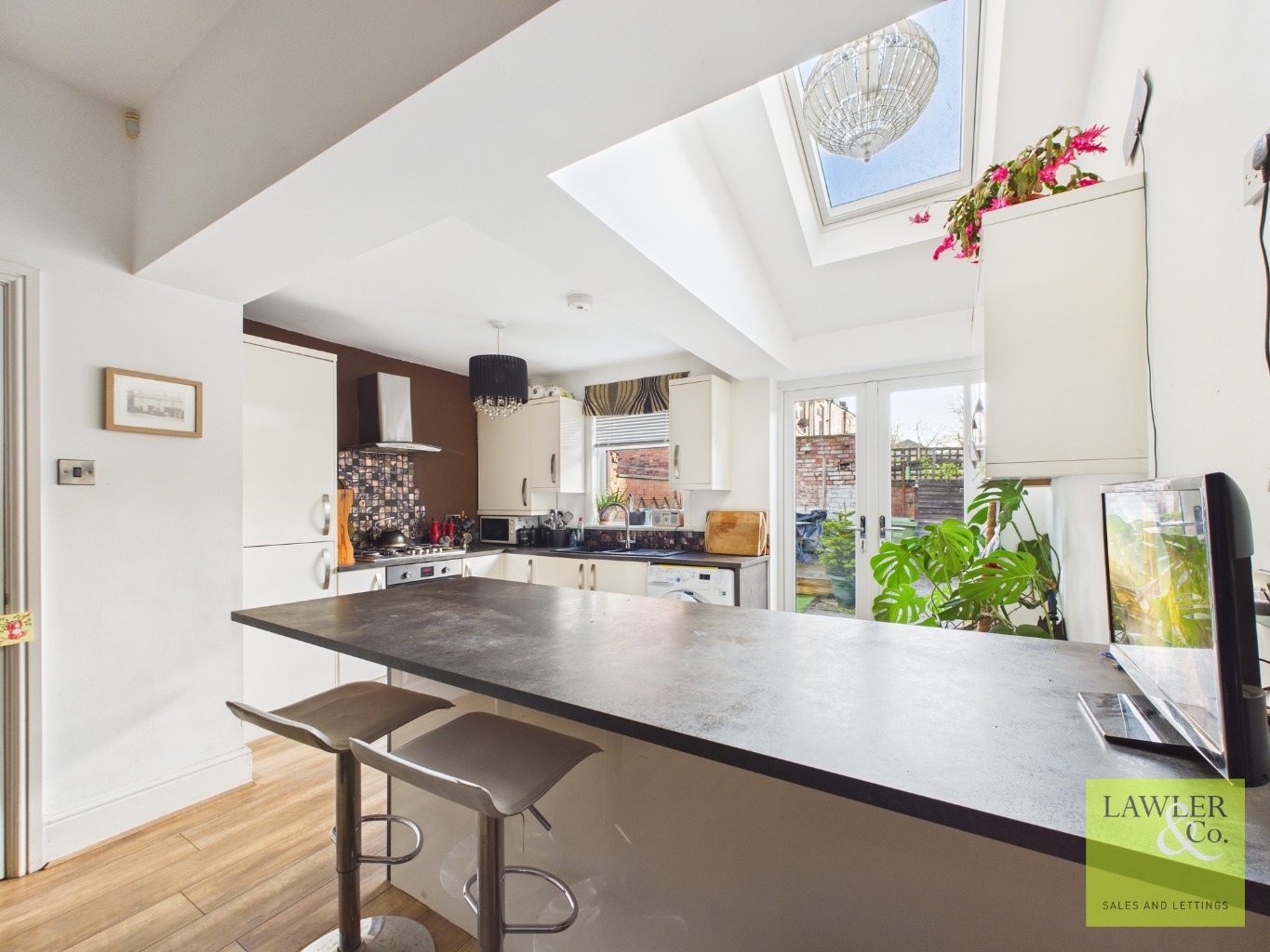 Natural light floods in via a Velux window and French doors, which open out onto the private rear courtyard garden. Storage is provided by built-in storage cupboards and a spacious under-stairs cupboard that doubles as a pantry.
