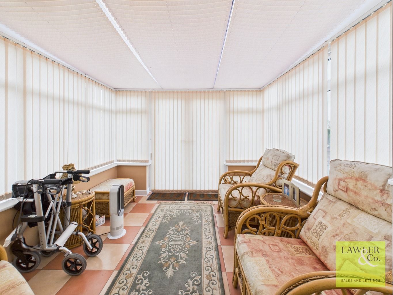 Upon entry, a bright porch leads into a generous hallway, providing access to the light and airy living room. This inviting space features a cosy gas fireplace, a bay window full of character and ample room for both lounging and dining. Situated to the rear of the home, the spacious conservatory benefits from patio doors that open out onto the south-west-facing garden, providing an excellent space for relaxation and entertaining. The partially tiled kitchen offers space for appliances with direct access to the side. Completing the ground floor is a useful, partially tiled WC fitted with a vanity wash basin.