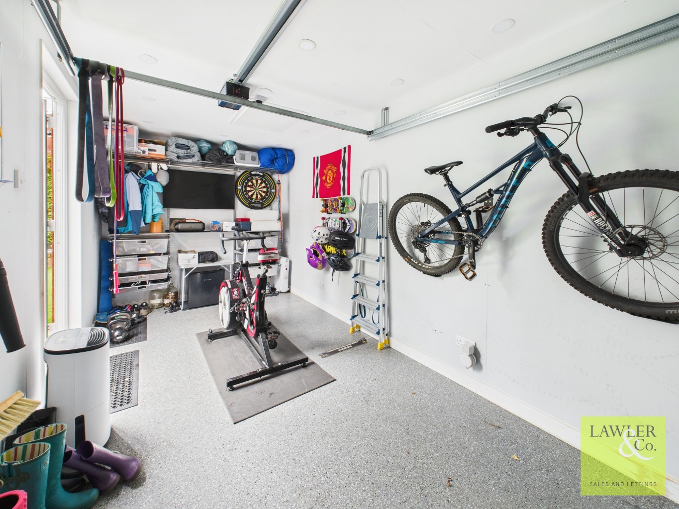 Outside, the rear garden is a lovely family-friendly space, with artificial grass for low maintenance, and plenty of room for seating, summer BBQs, and kids to play. There’s also a garage, currently set up as a home gym but it could easily become a workshop, studio, or extra storage depending on your needs.