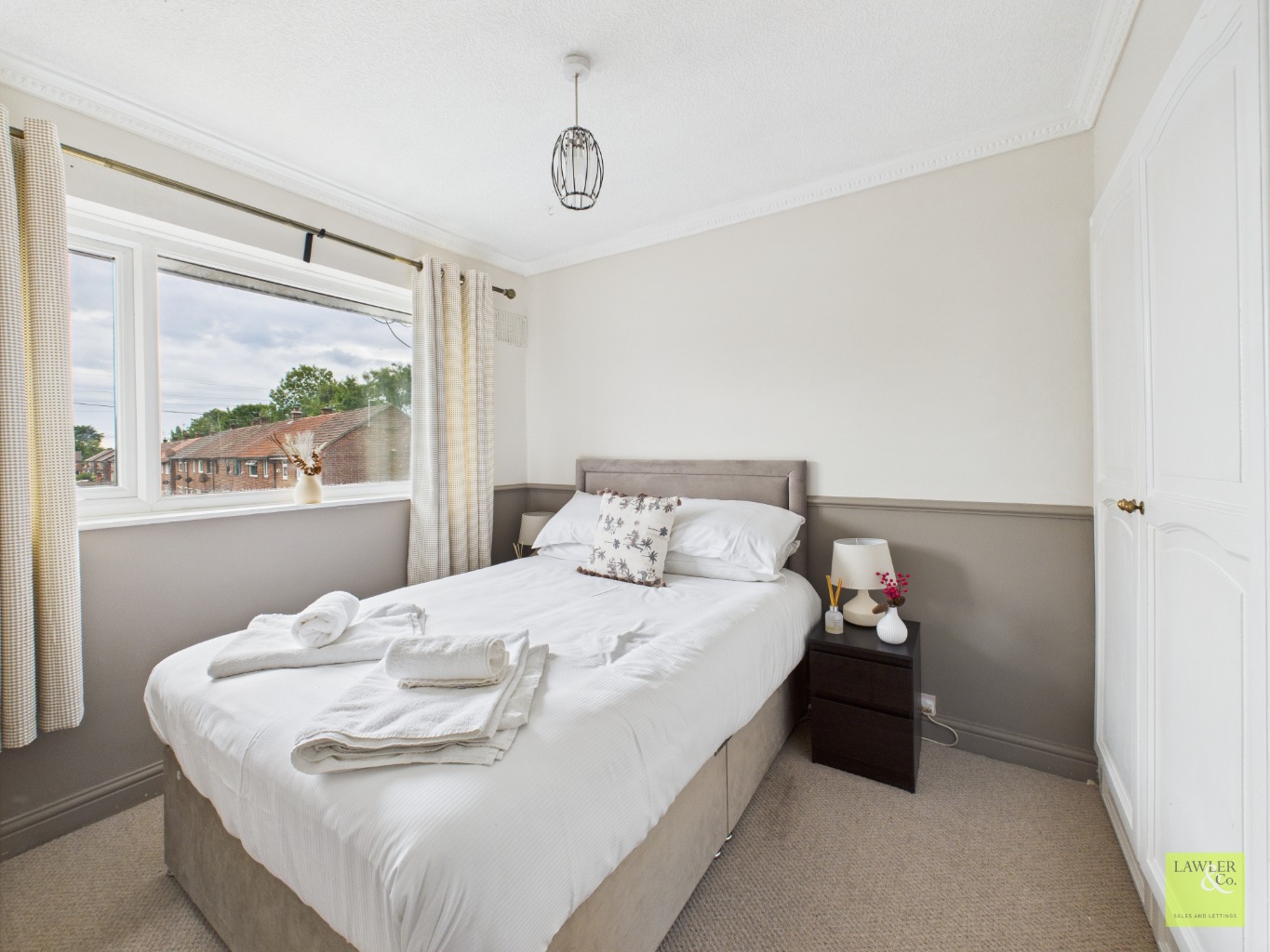 Outside, the property is set back from the road with a low-maintenance front garden and pathway access. The rear garden is a good size — predominantly laid to lawn, with a paved patio area perfect for outdoor seating, enclosed by fencing for privacy and security. There is also gated access to the rear and plenty of scope for personalisation if desired.