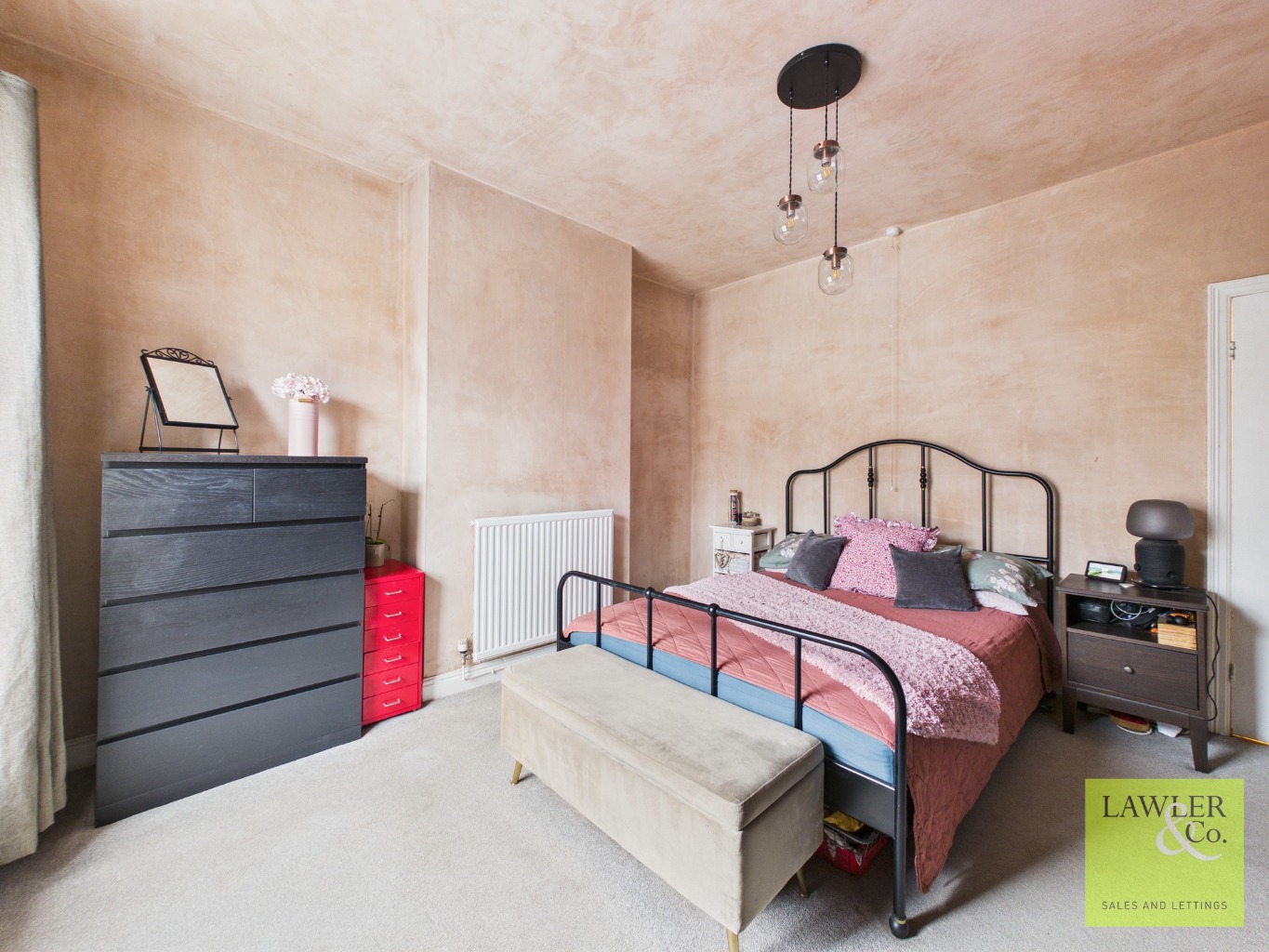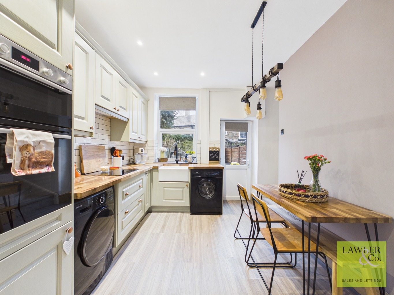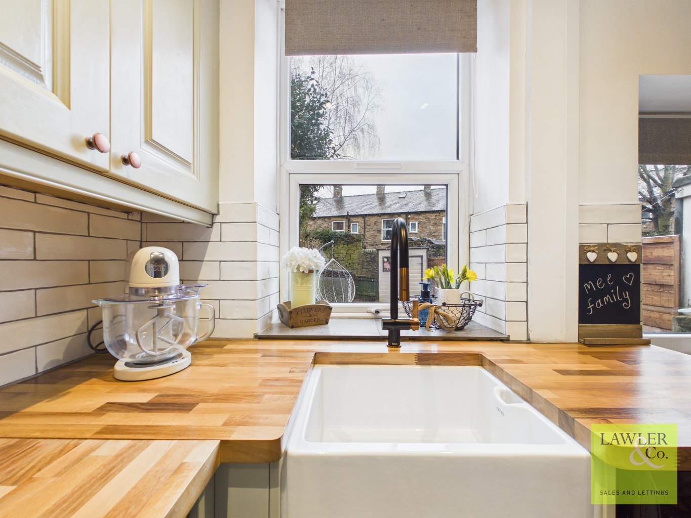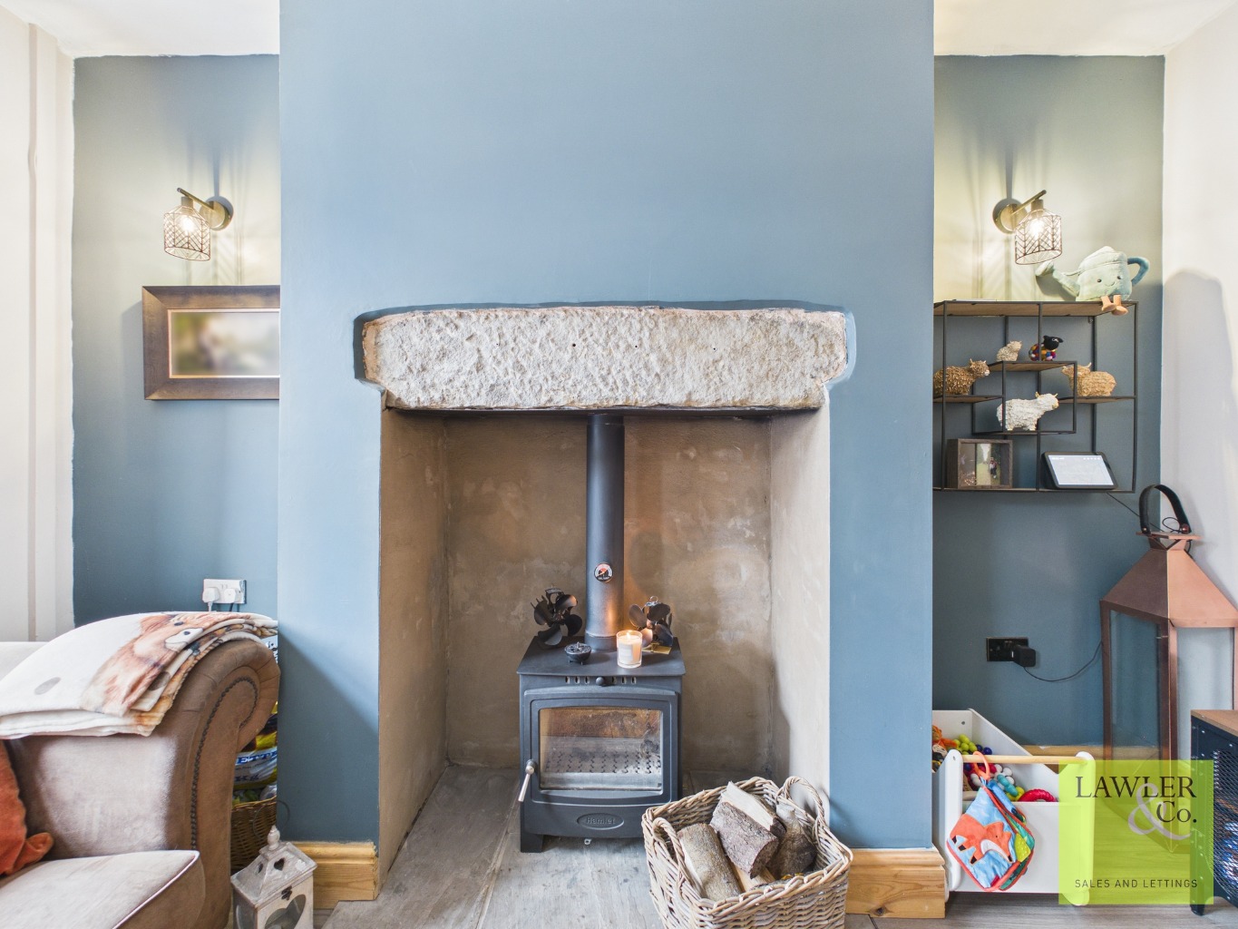 Upon entering, you are welcomed into a spacious living room, featuring a charming log burner set within stone surrounds, flanked by handy alcoves. The generous kitchen/diner is fitted with matching wall and base units, a classic Belfast sink, a Bosch electric oven, Beko induction hob, and extractor fan, complemented by stylish tiling that adds character. There is ample space for appliances, plus a useful pantry providing plenty of additional storage. From here, you can step out into the south-east facing rear garden, perfect for entertaining.