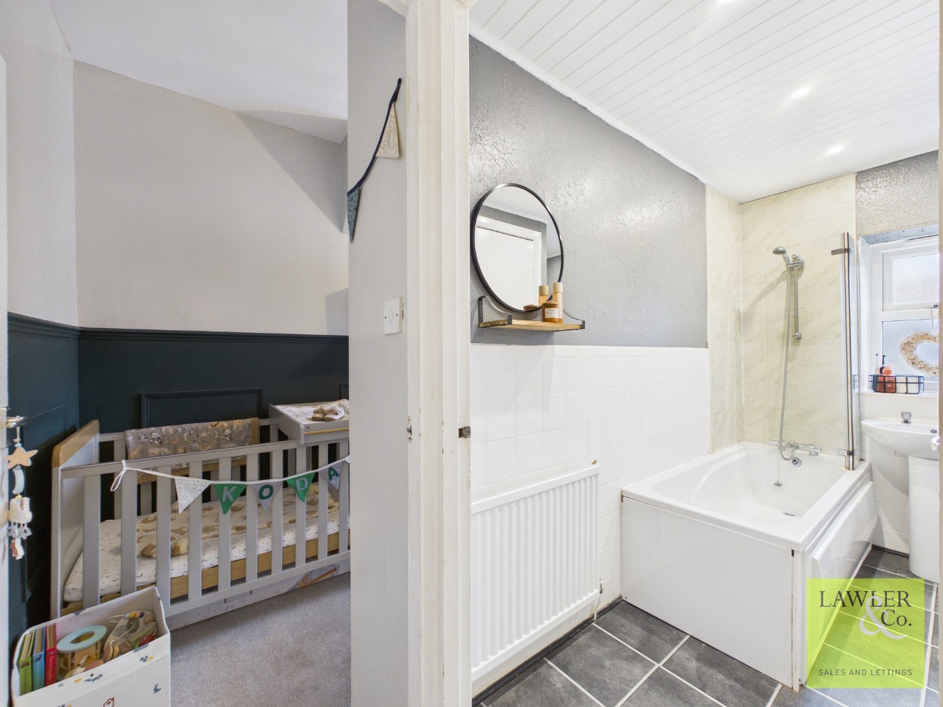 Upstairs, the spacious master double bedroom enjoys pleasant views over the front of the property. The second bedroom features decorative wood panelling and overlooks the rear. The partially tiled family bathroom is fitted with a bath with overhead shower, a wash basin, and a WC along with a handy storage cupboard.