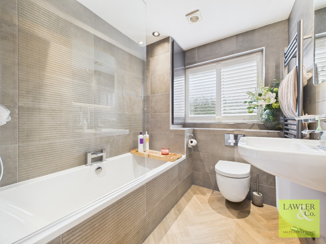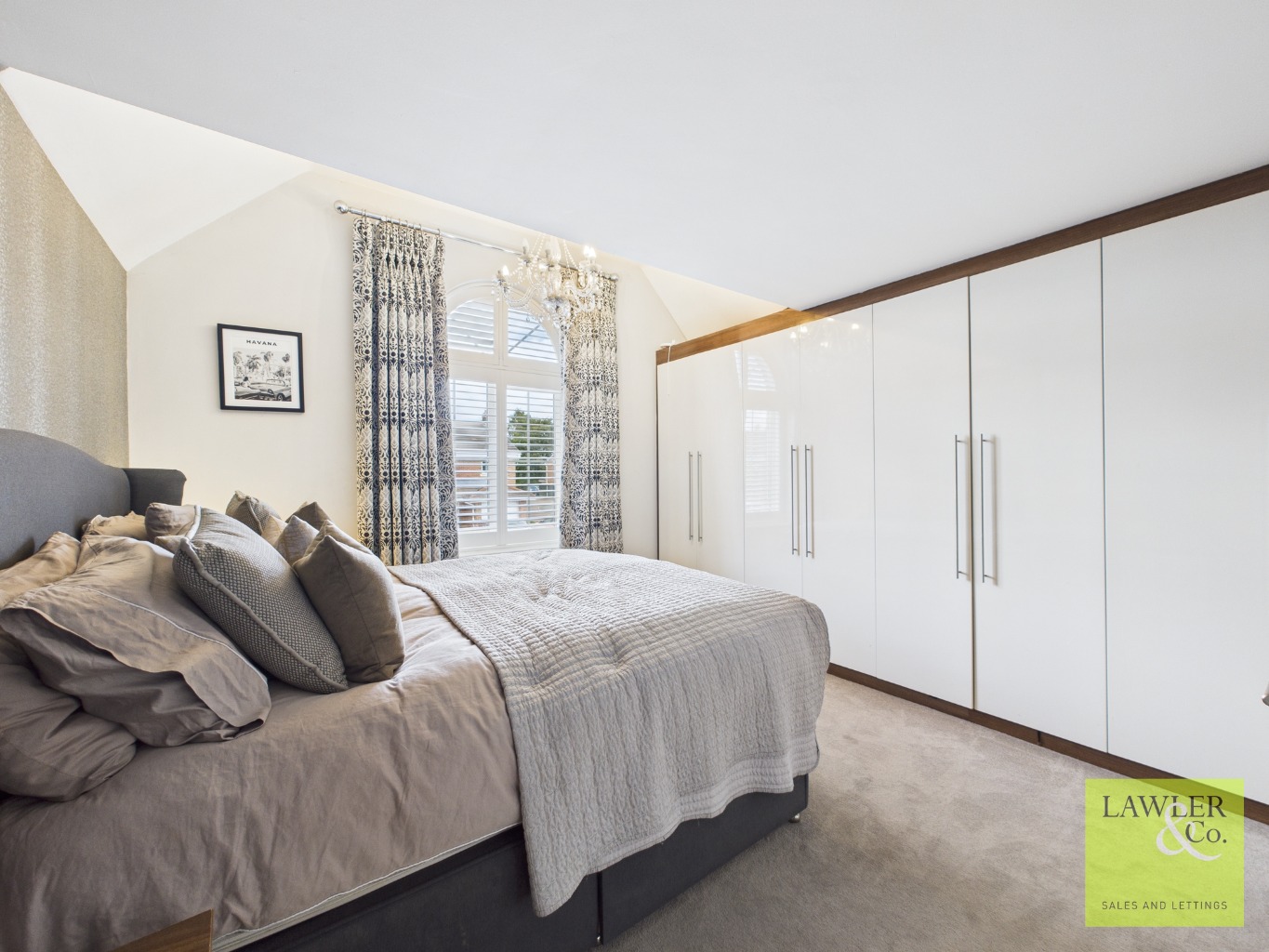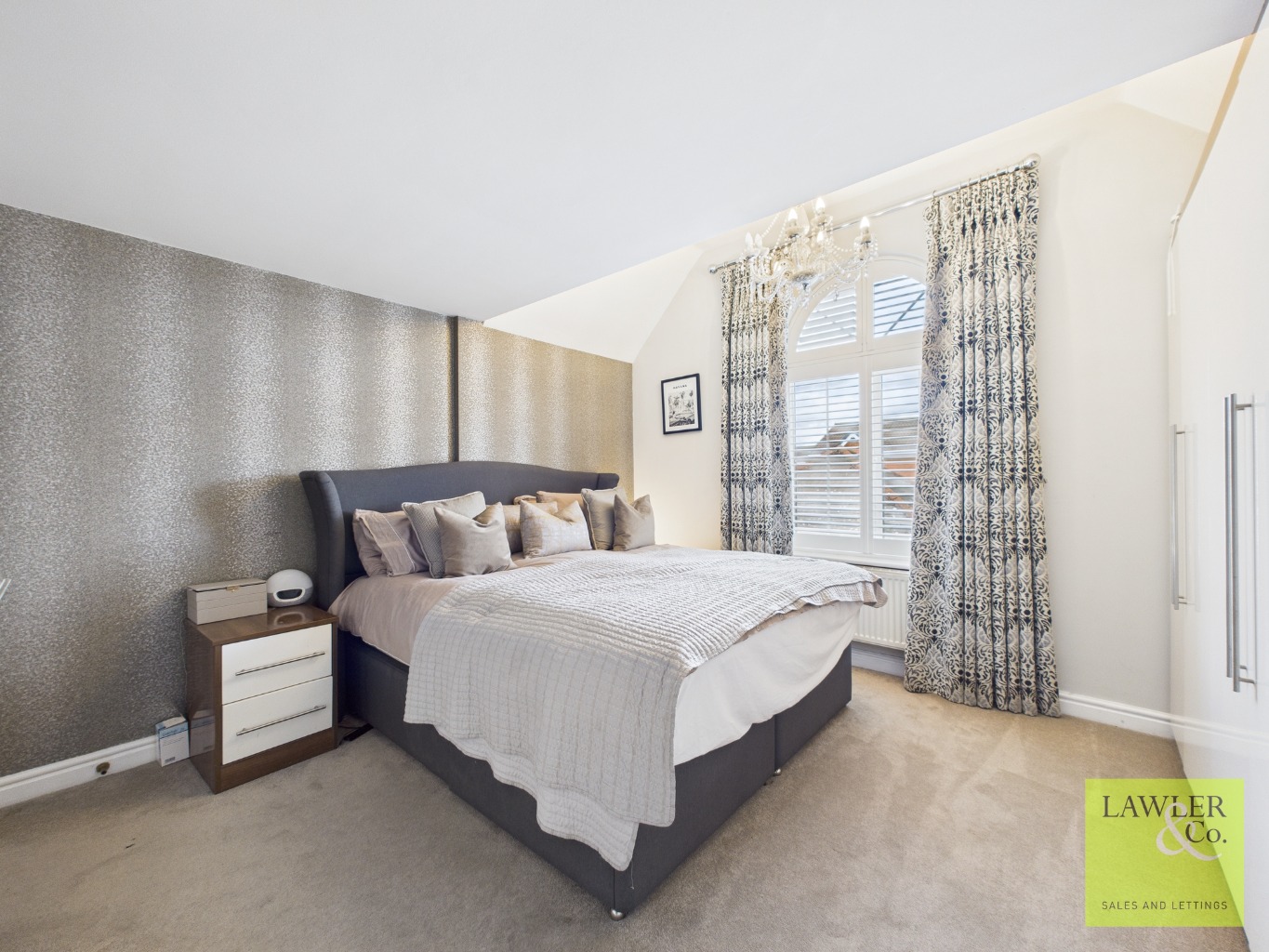 Upstairs, there are four generously sized bedrooms, all featuring fitted wardrobes and shutter blinds. The master bedroom is a standout, offering high ceilings, a beautiful arched front-facing window, and a stylish three-piece en-suite bathroom. A modern and well-presented family bathroom serves the remaining bedrooms.