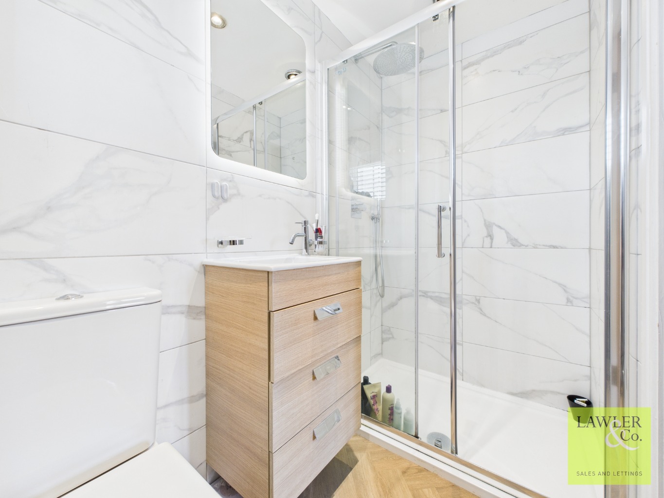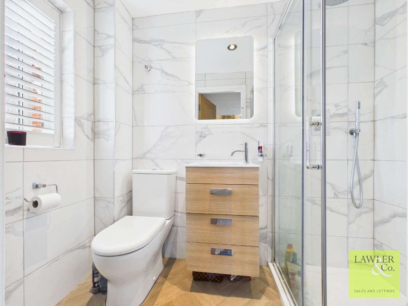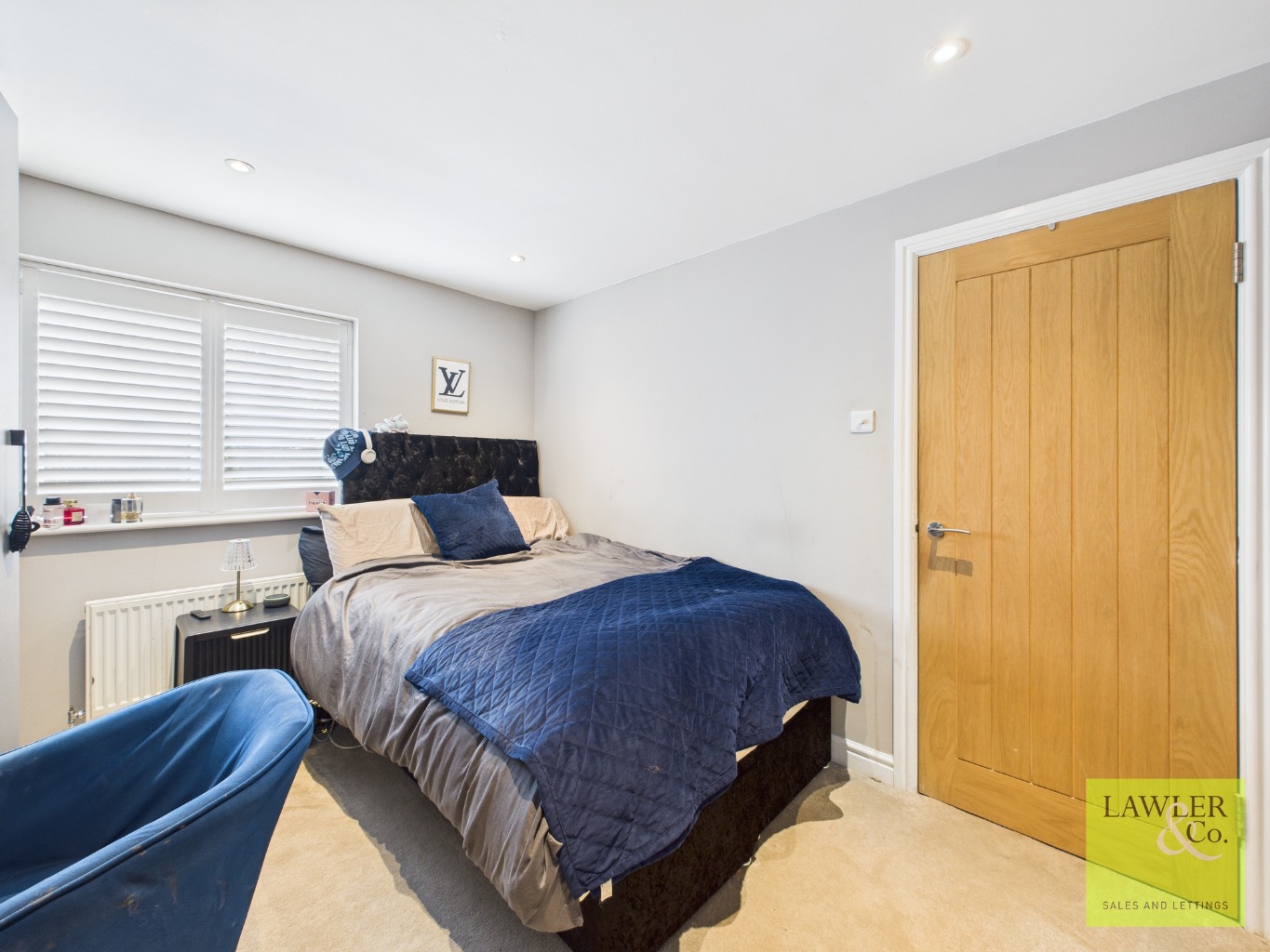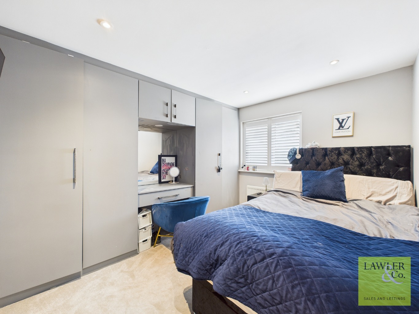 Upstairs, there are four generously sized bedrooms, all featuring fitted wardrobes and shutter blinds. The master bedroom is a standout, offering high ceilings, a beautiful arched front-facing window, and a stylish three-piece en-suite bathroom. A modern and well-presented family bathroom serves the remaining bedrooms.