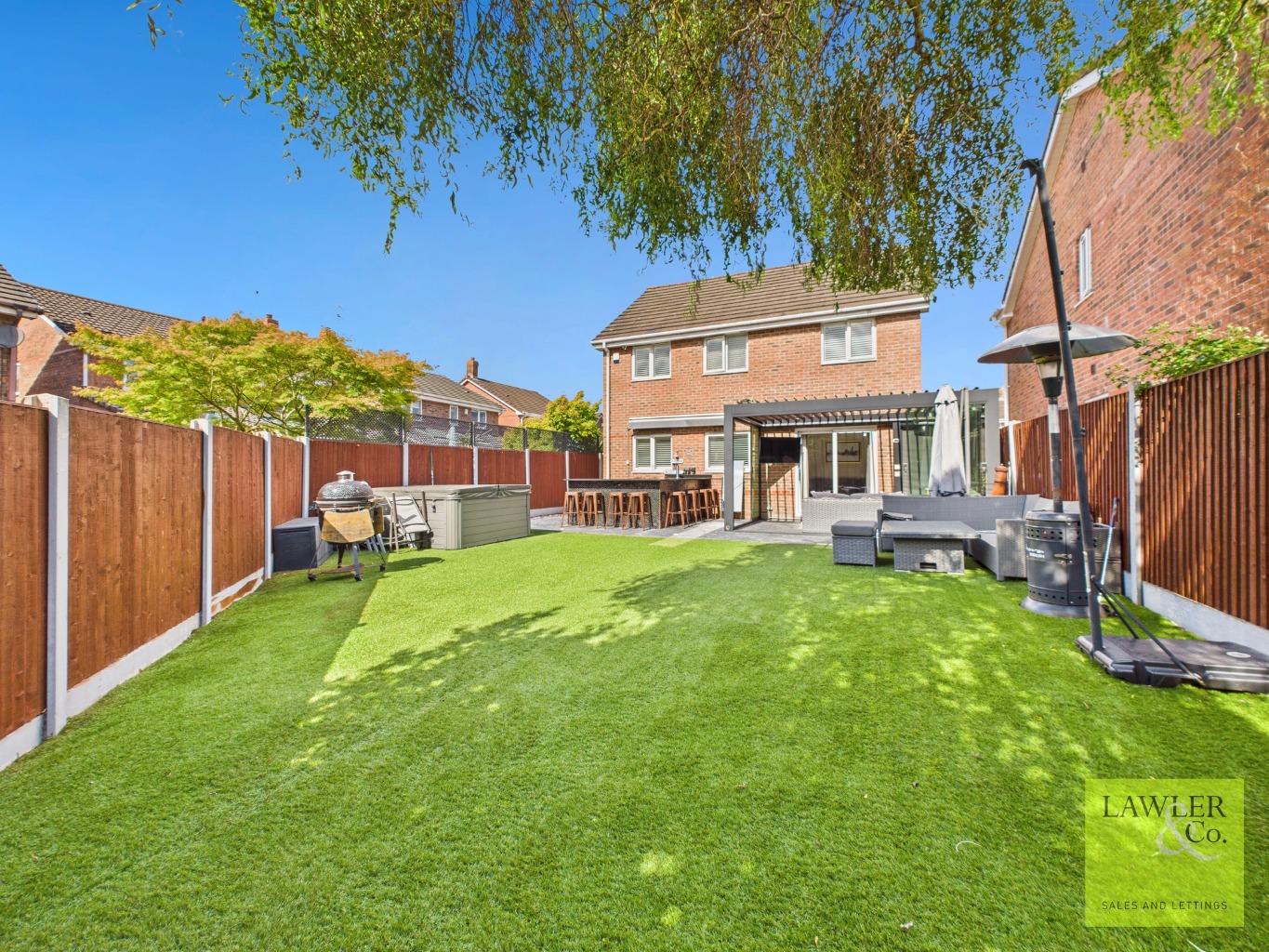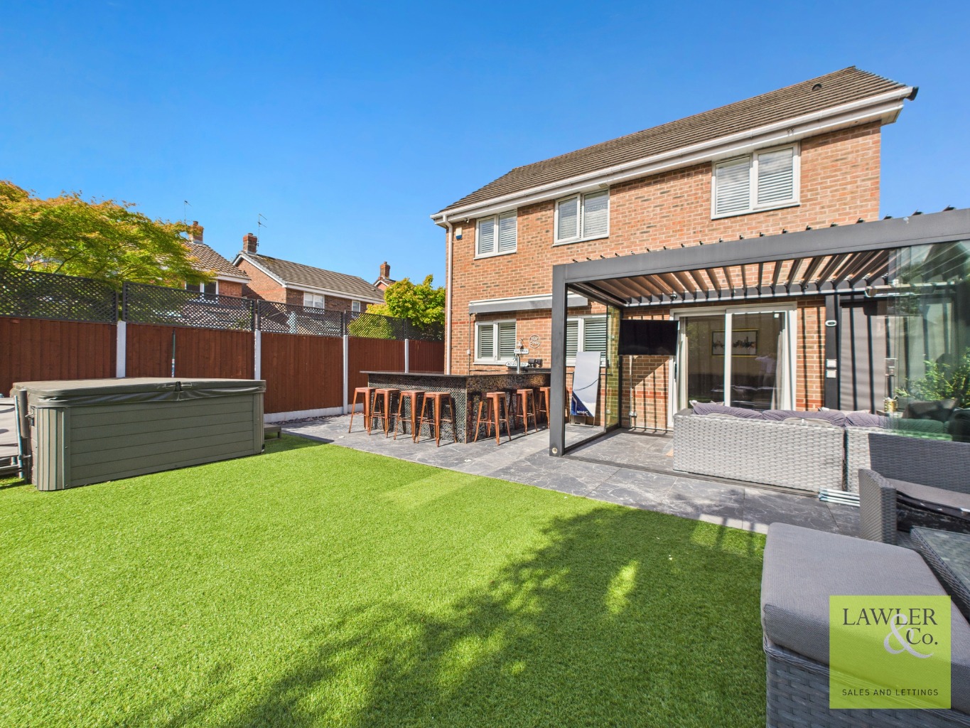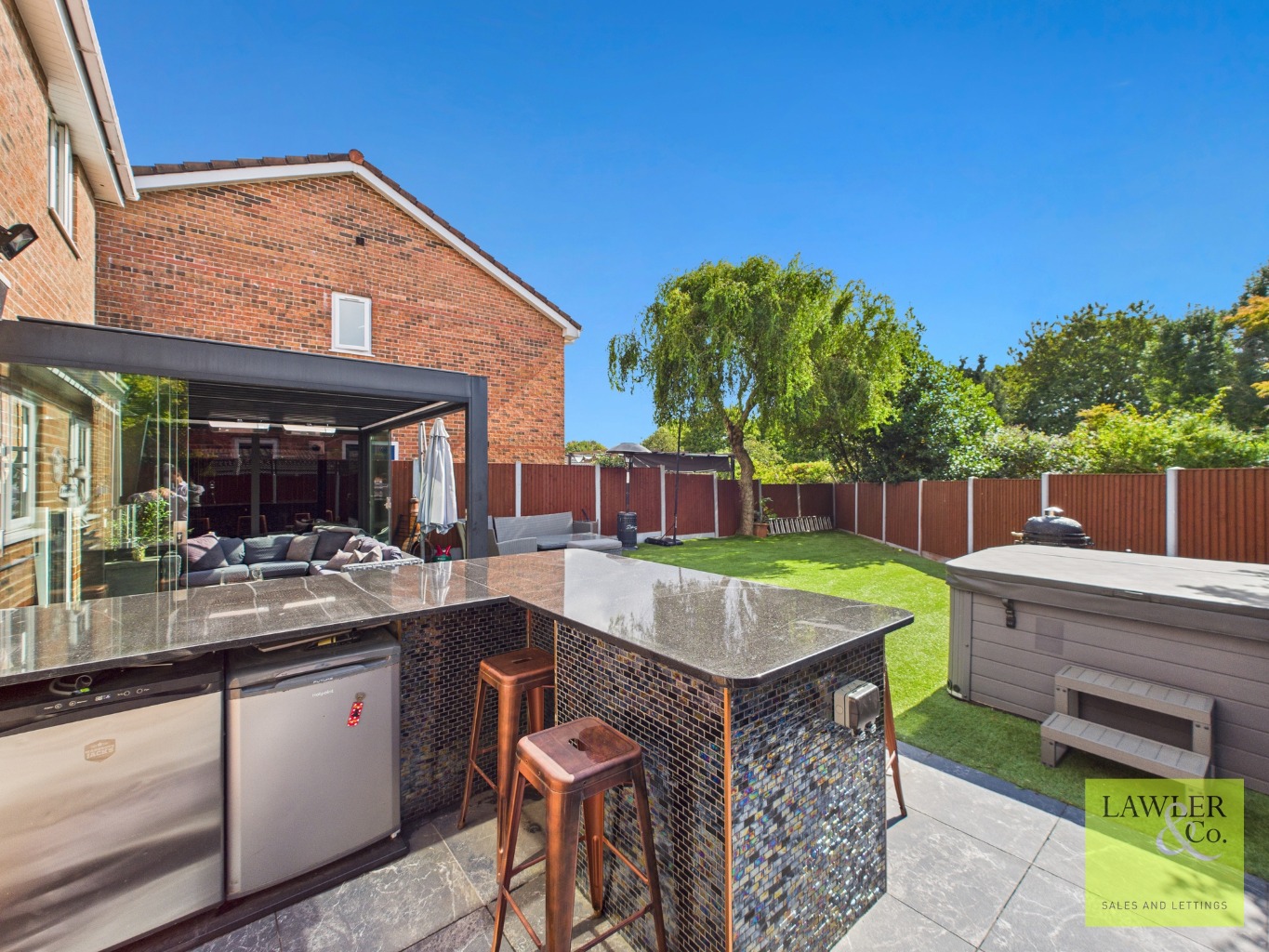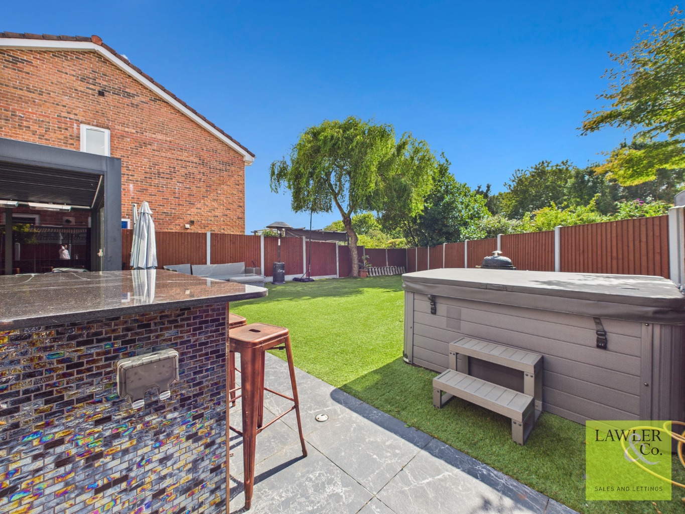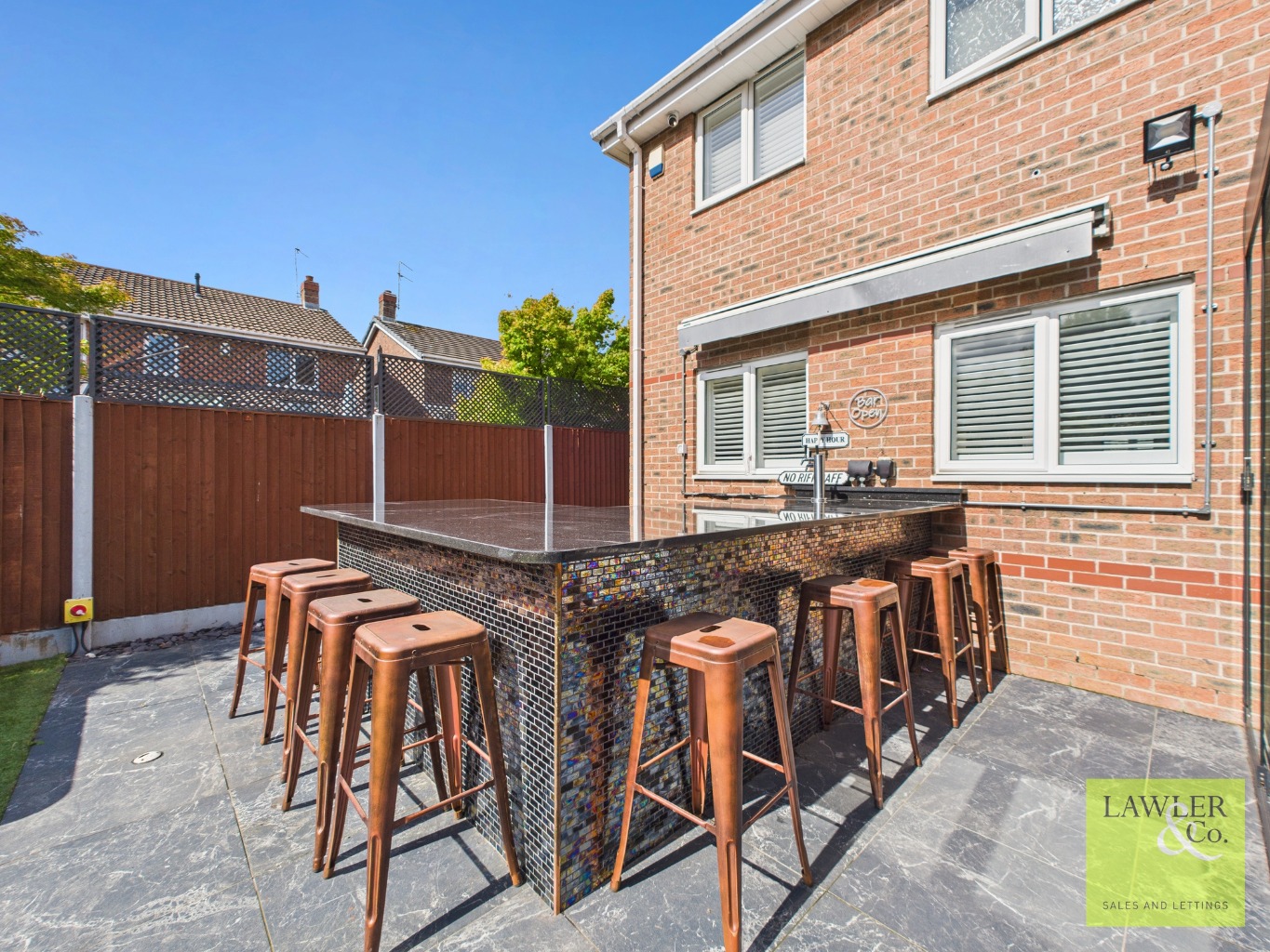 Further enhancing the outdoor space is a fully equipped bar area with working beer pumps and a retractable canopy, along with a dedicated hot tub zone. The south-facing garden is laid with low-maintenance AstroTurf and benefits from excellent privacy and sunshine throughout the day. For added peace of mind, the property is also fitted with external security cameras.