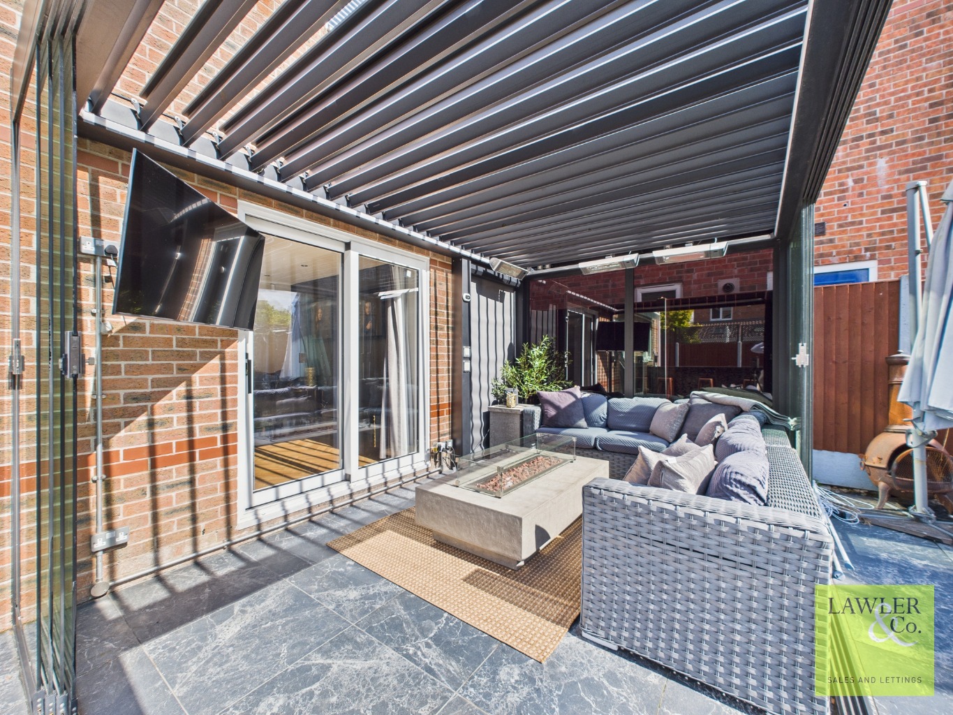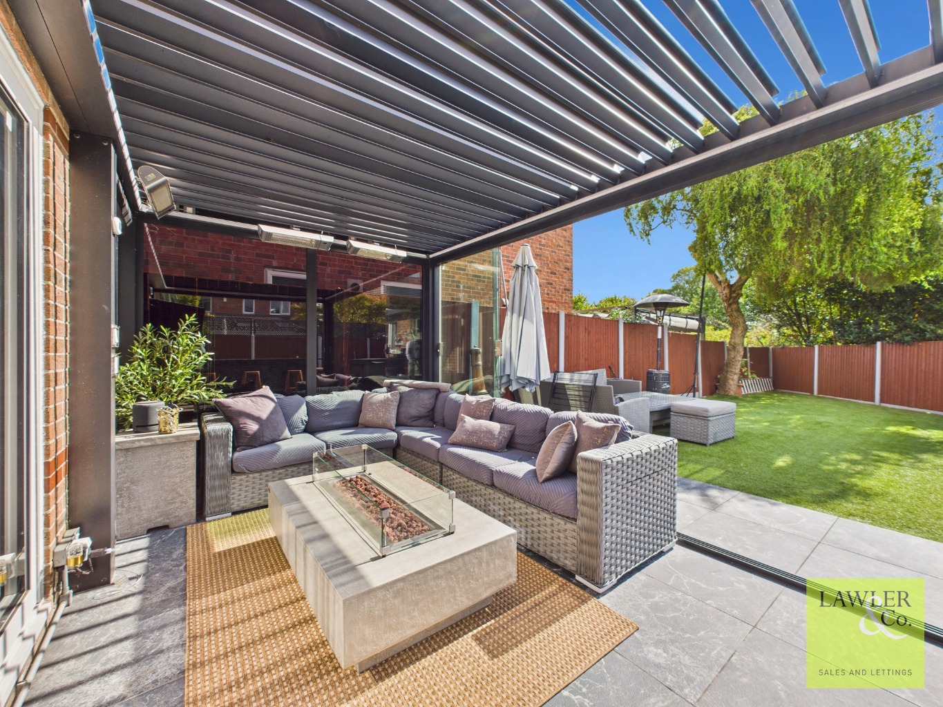 To the rear of the property is a private garden haven, starting with a luxurious bioclimatic glass garden room. This impressive space features heating, a retractable electric louvered roof, and full-width glass doors that open completely, making it ideal for year-round use, from cosy winter evenings to lively summer gatherings.